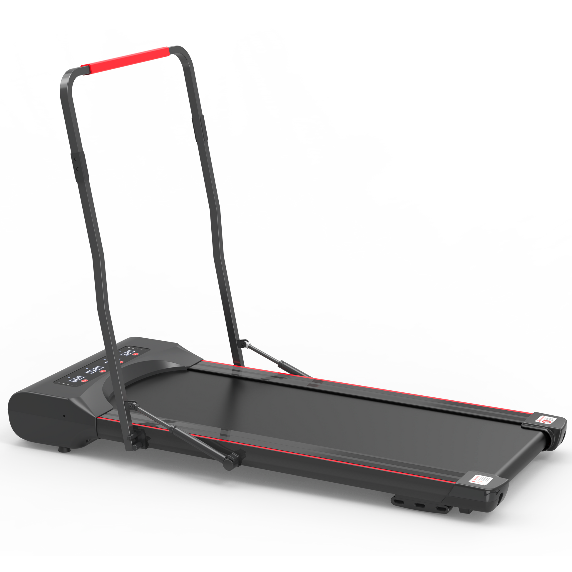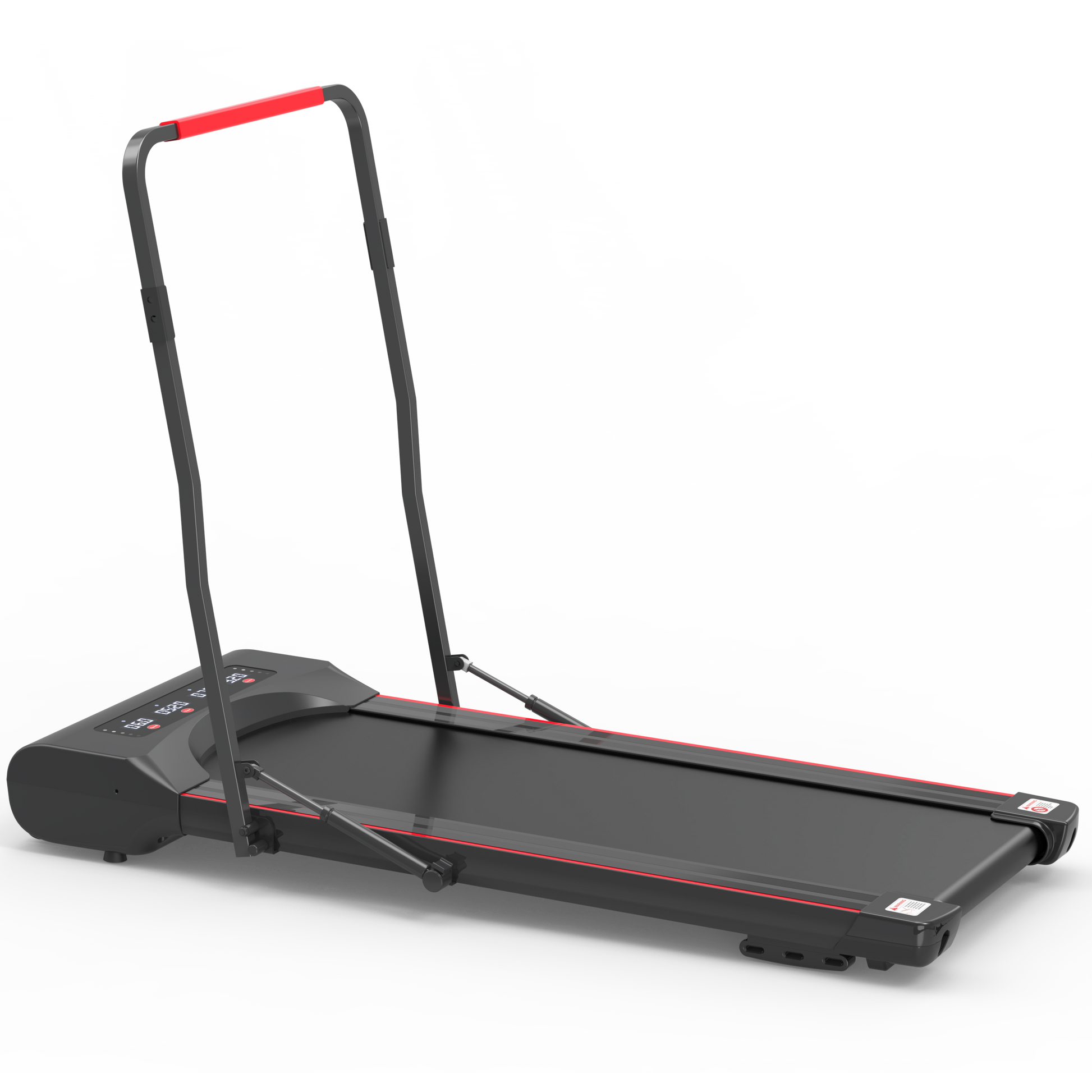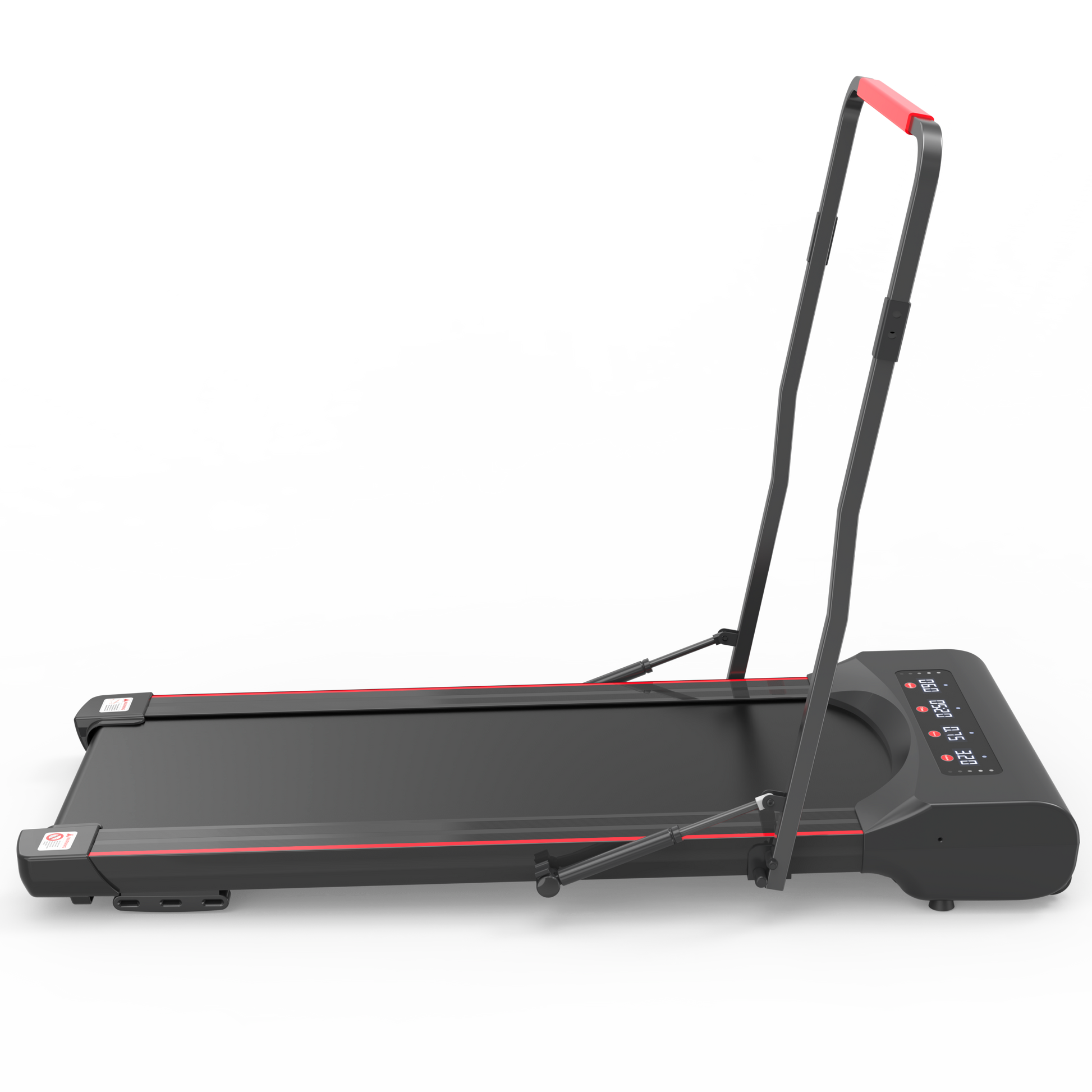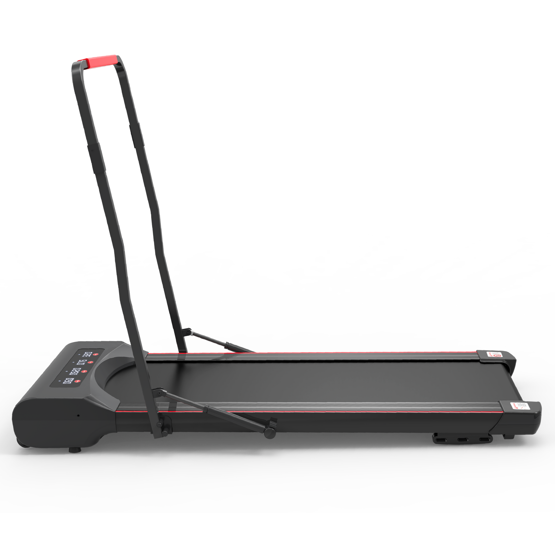 Foldable treadmill machine is designed with a pair of Hydraulic Cylinder Rods that are extended to support the vertical columns. Just pull the handle bar of walking pad treadmill down by one hand, the hydraulic rods are smoothly compressed and retracted, so the treadmill is folding up rapidly.