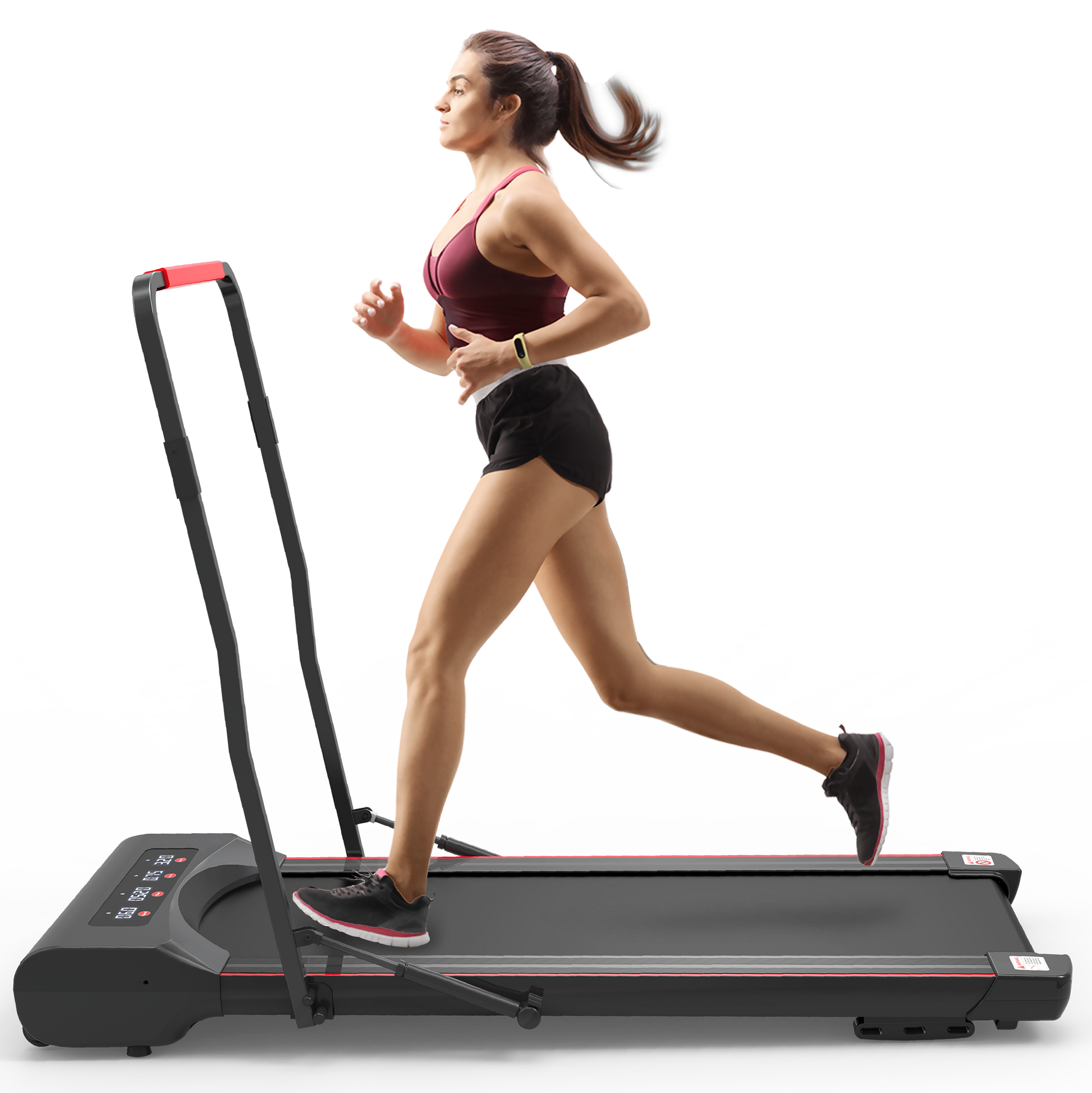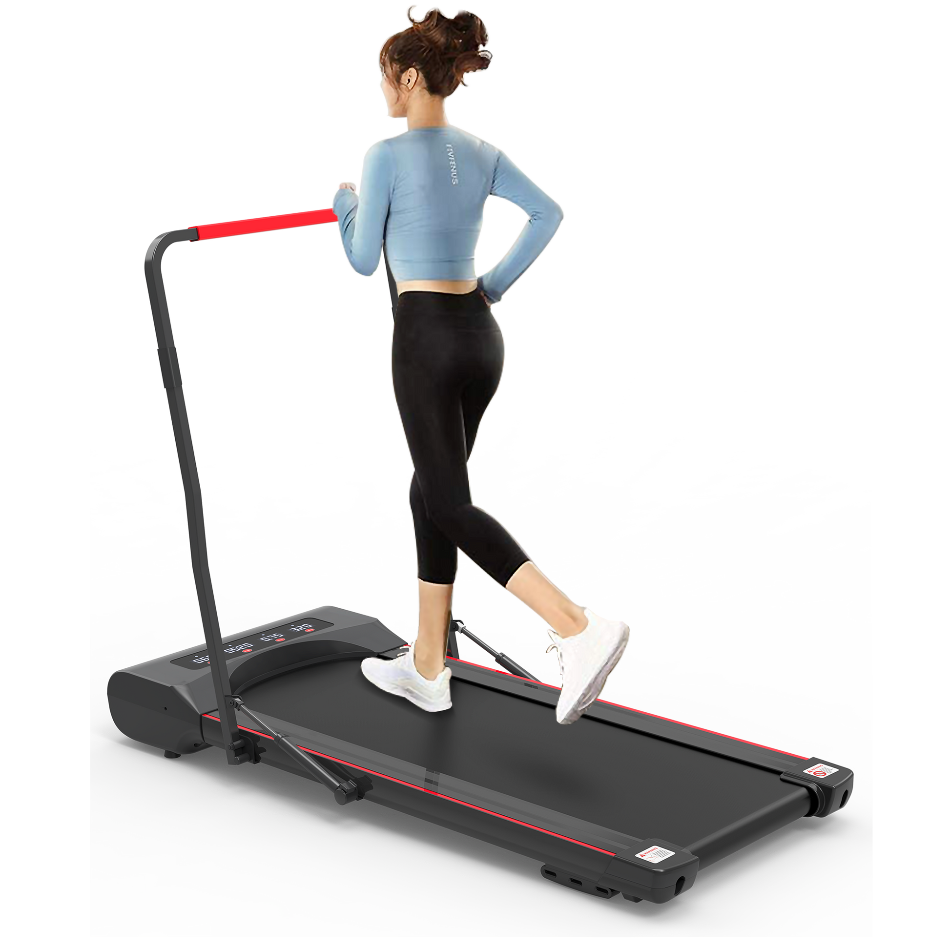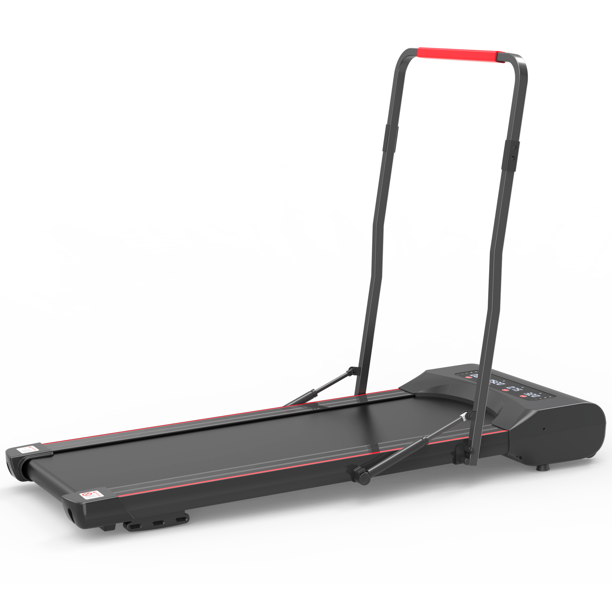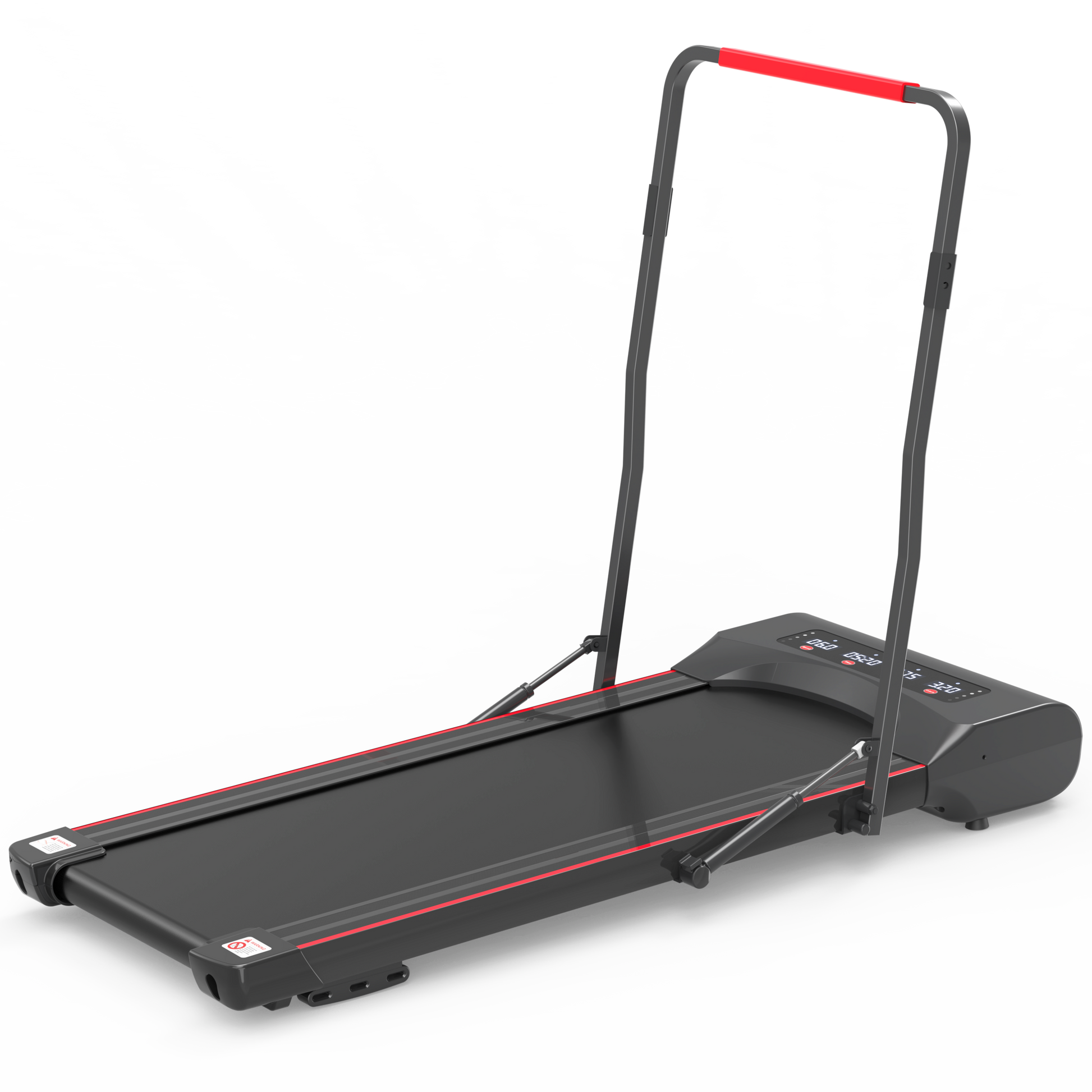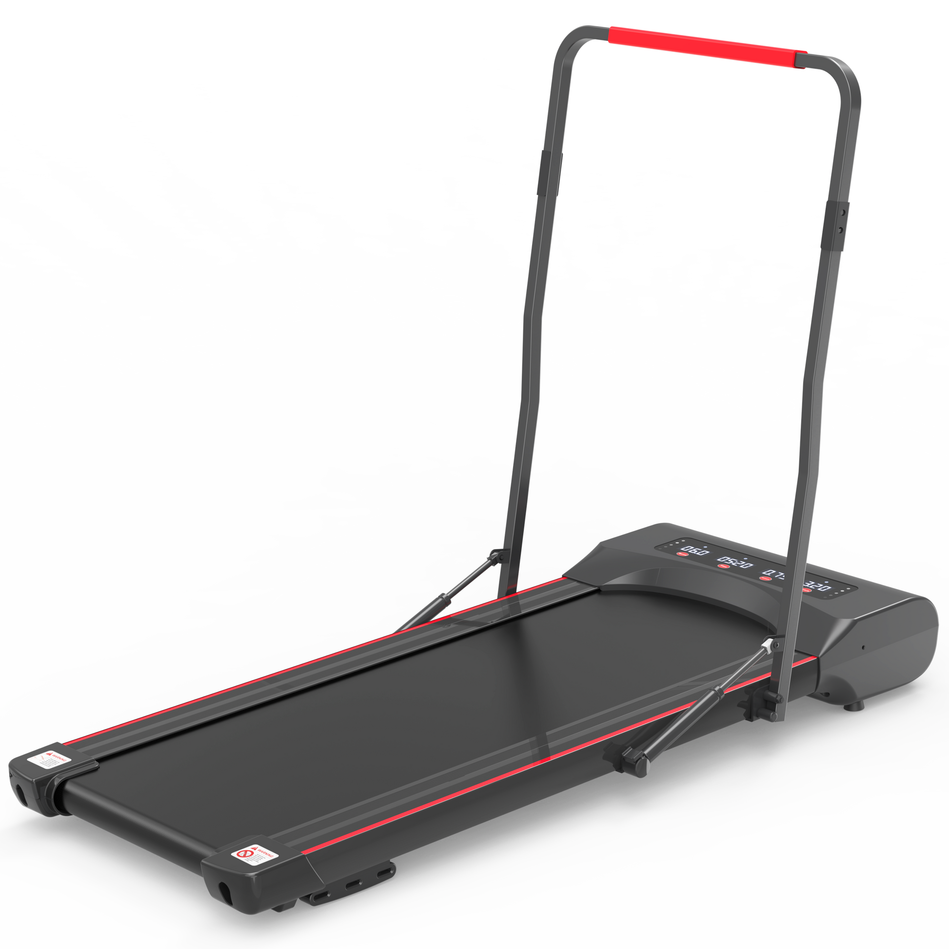 Foldable treadmill machine is designed with a pair of Hydraulic Cylinder Rods that are extended to support the vertical columns. Just pull the handle bar of walking pad treadmill down by one hand, the hydraulic rods are smoothly compressed and retracted, so the treadmill is folding up rapidly.