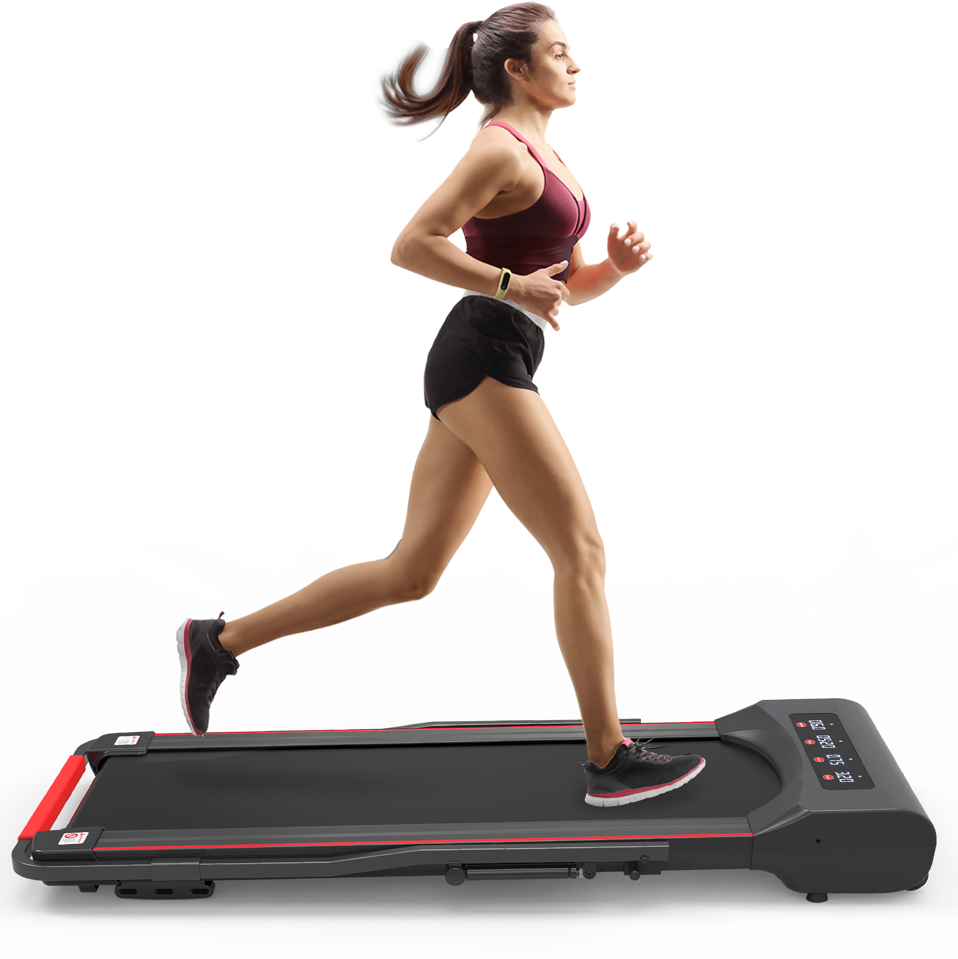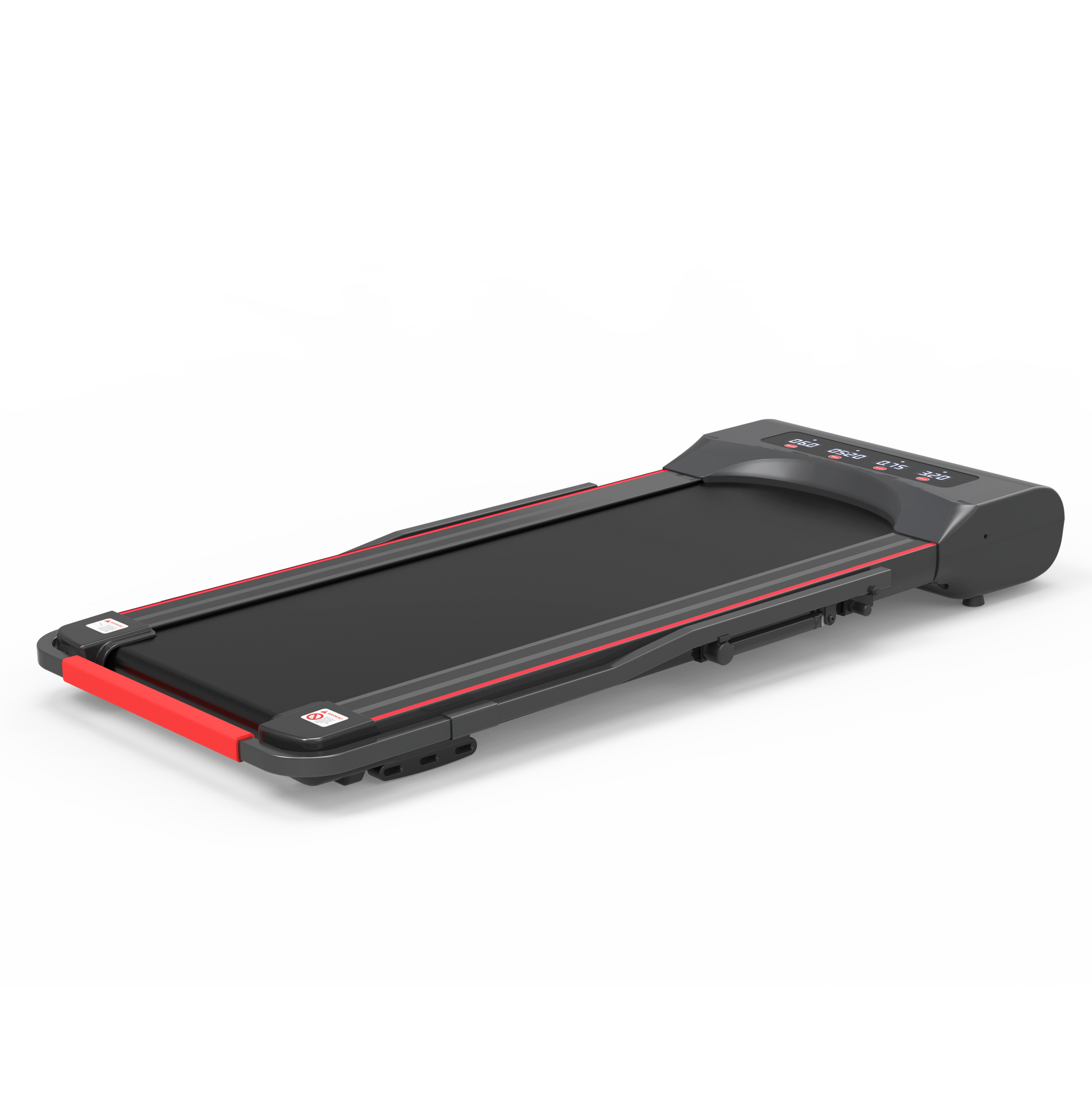 The progress of speed, distance, time and calories burned can be tracked in 4 big LED windows of the mini treadmill panel at the same time. You can also choose 12 pre-set programs one by one, change the speed or stop the treadmill running in an instant with the smart remote control.