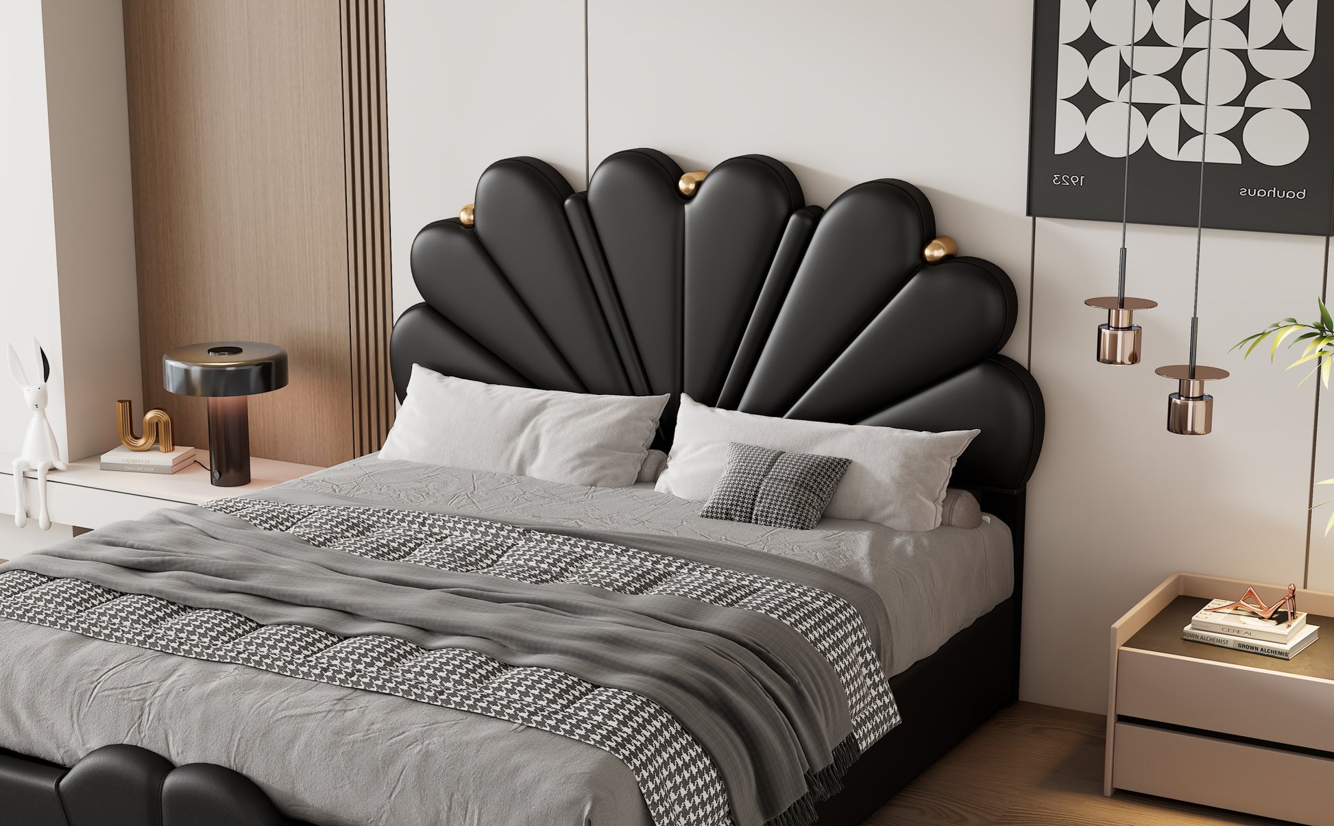 Queen Size Upholstered Petal Shaped Platform Bed with Hydraulic Storage System, PU Storage Bed, Decorated with metal balls, Black