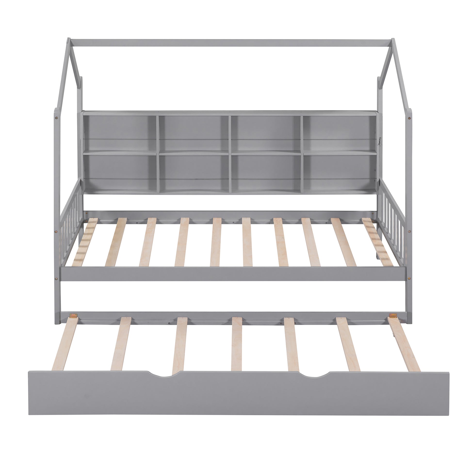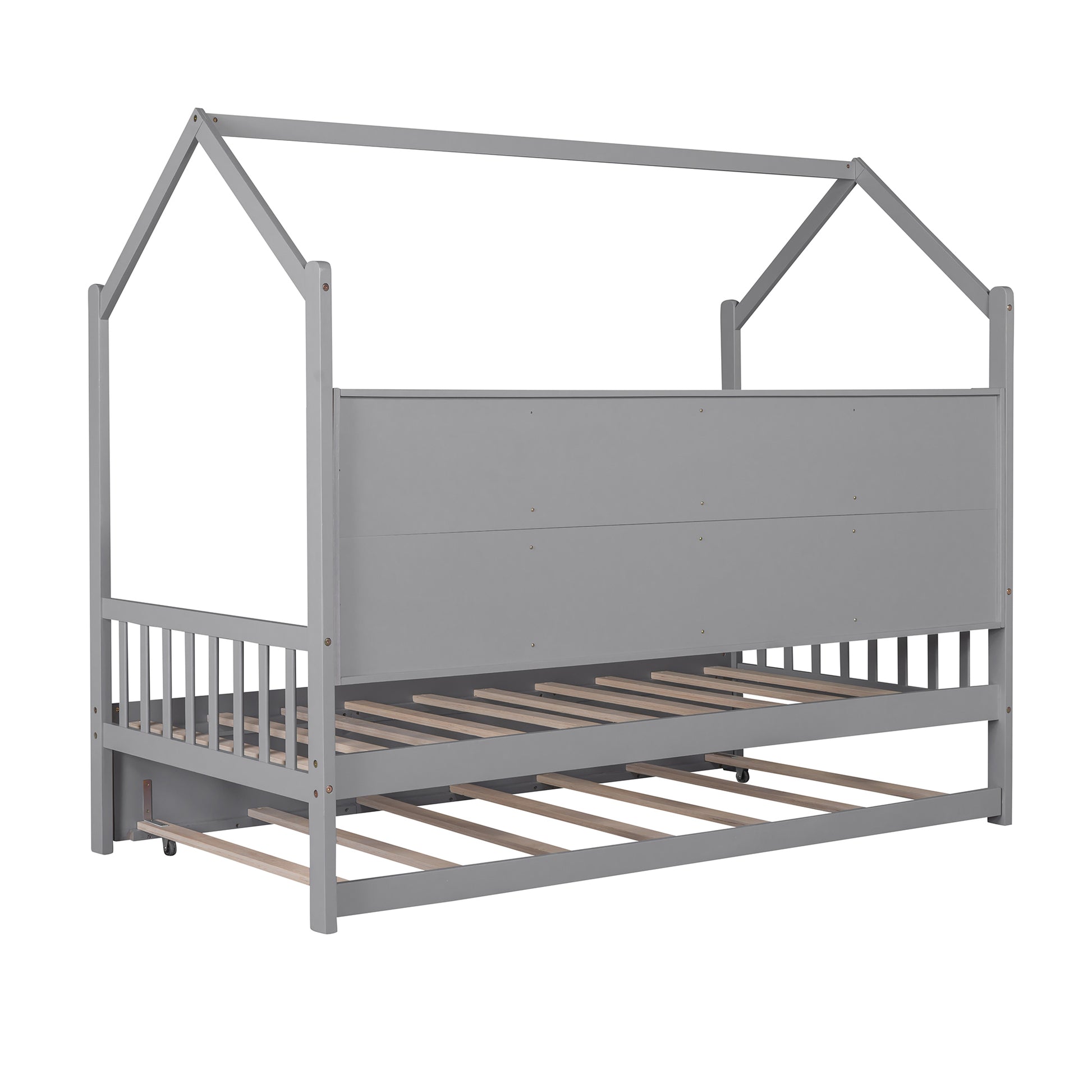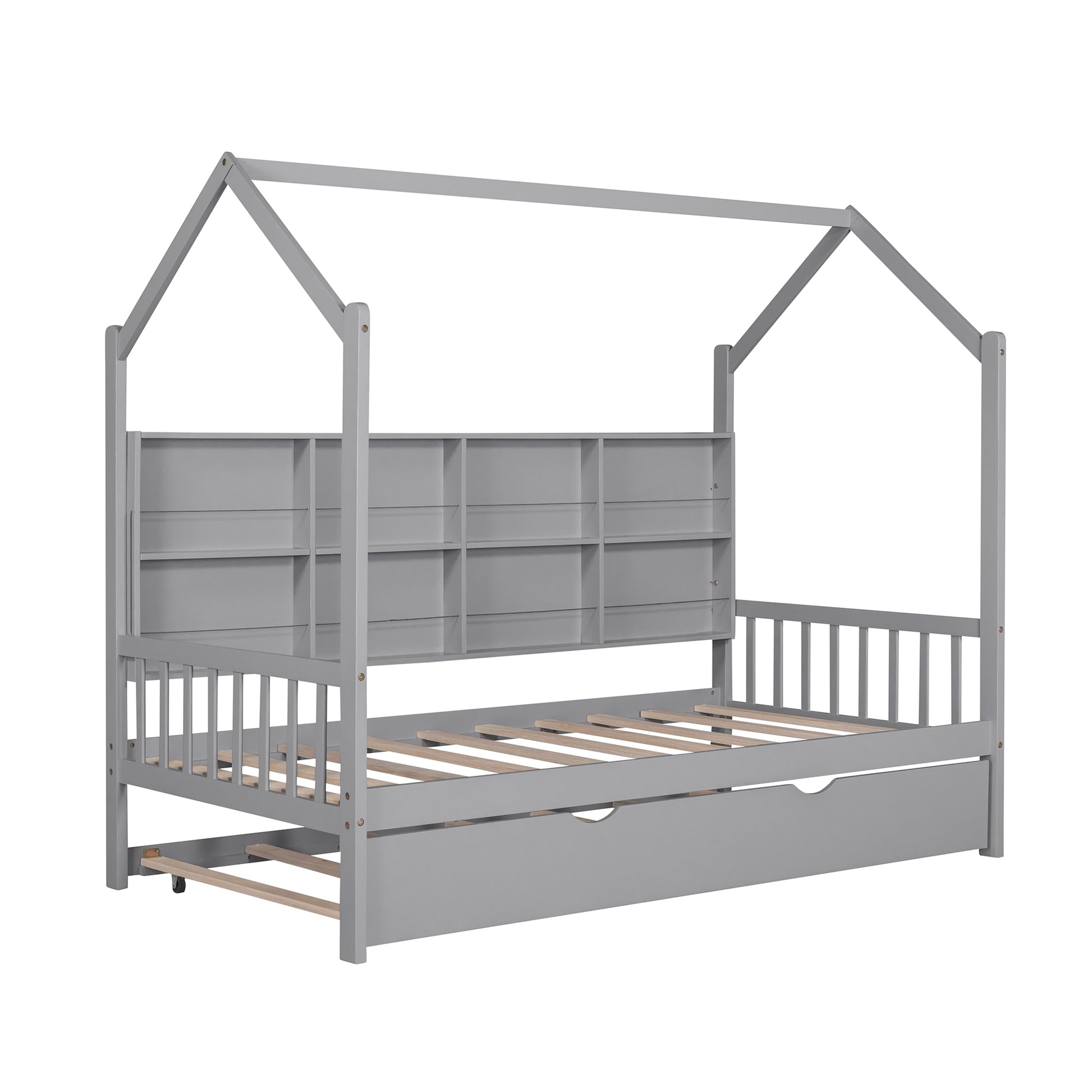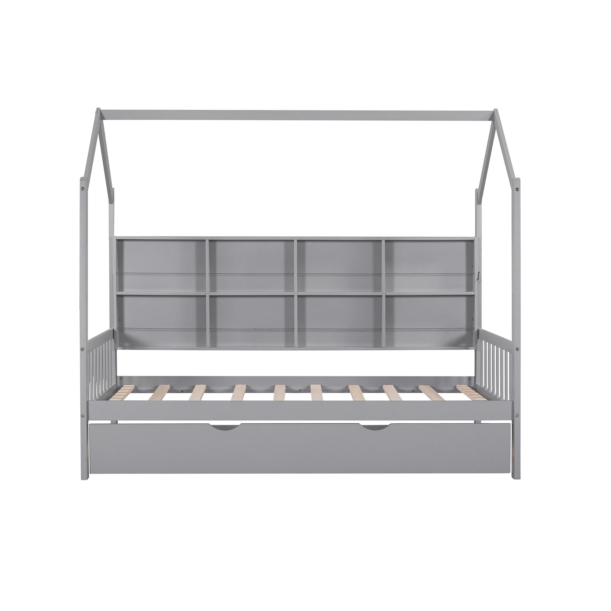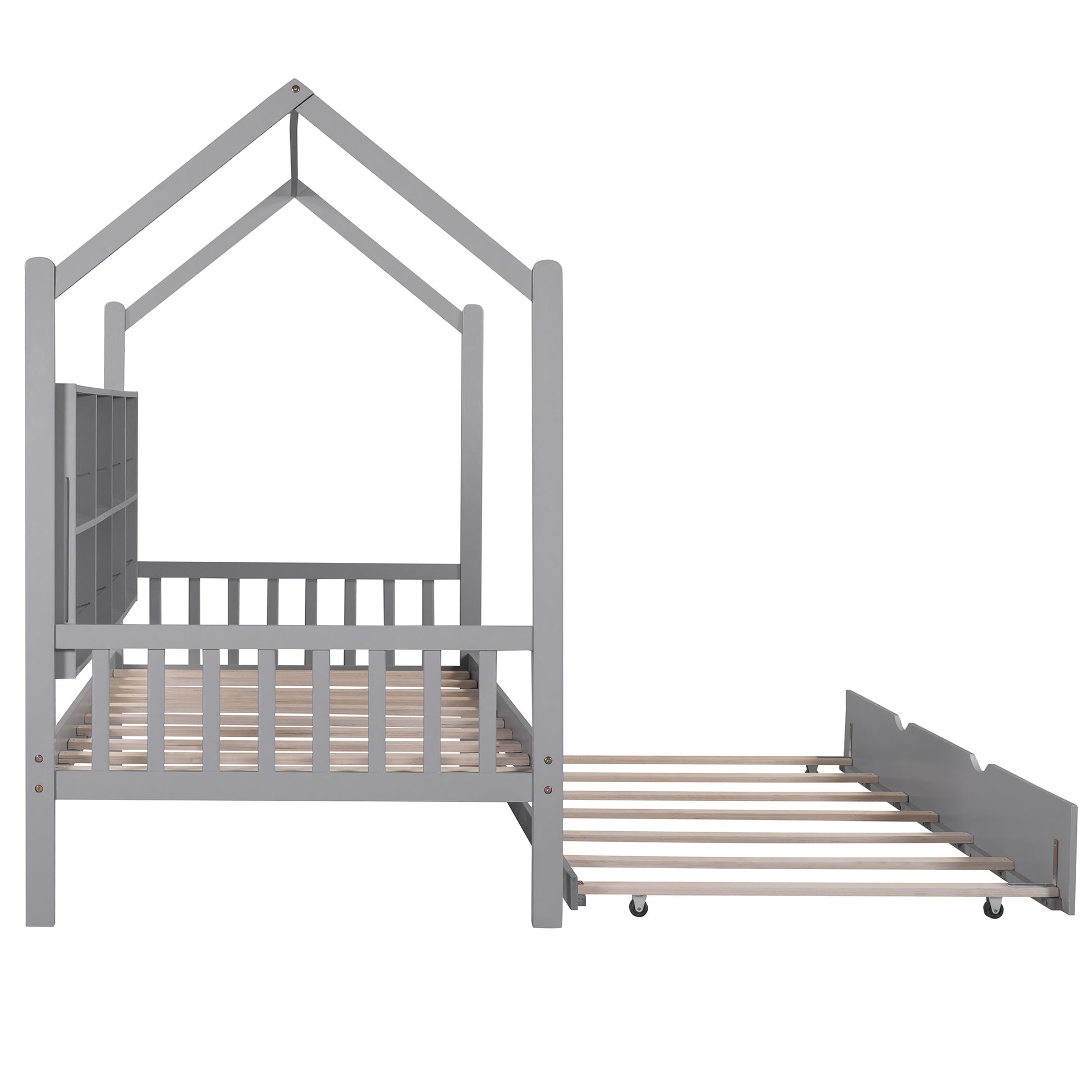 Wooden Twin Size House Bed with Trundle,Kids Bed with Shelf, Gray