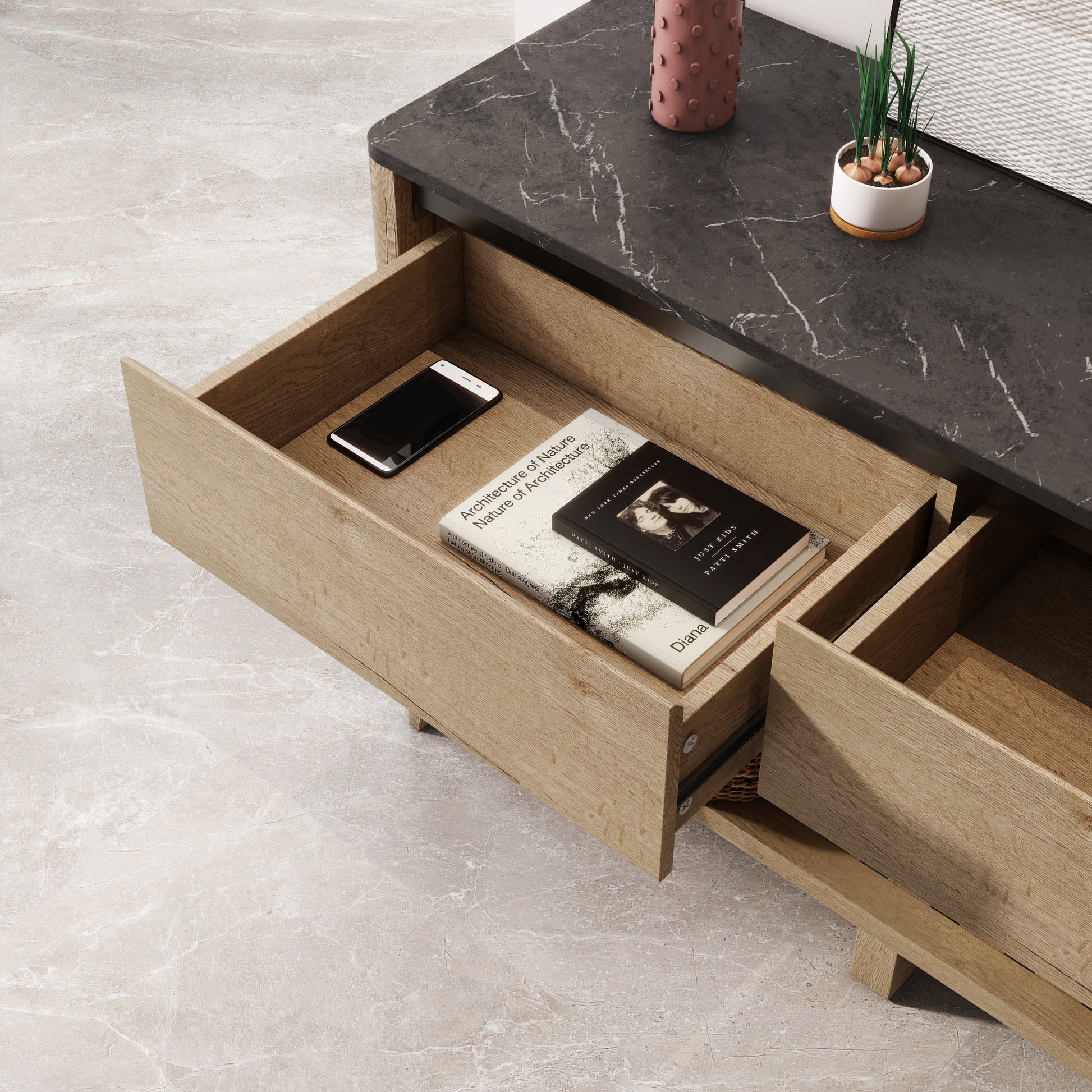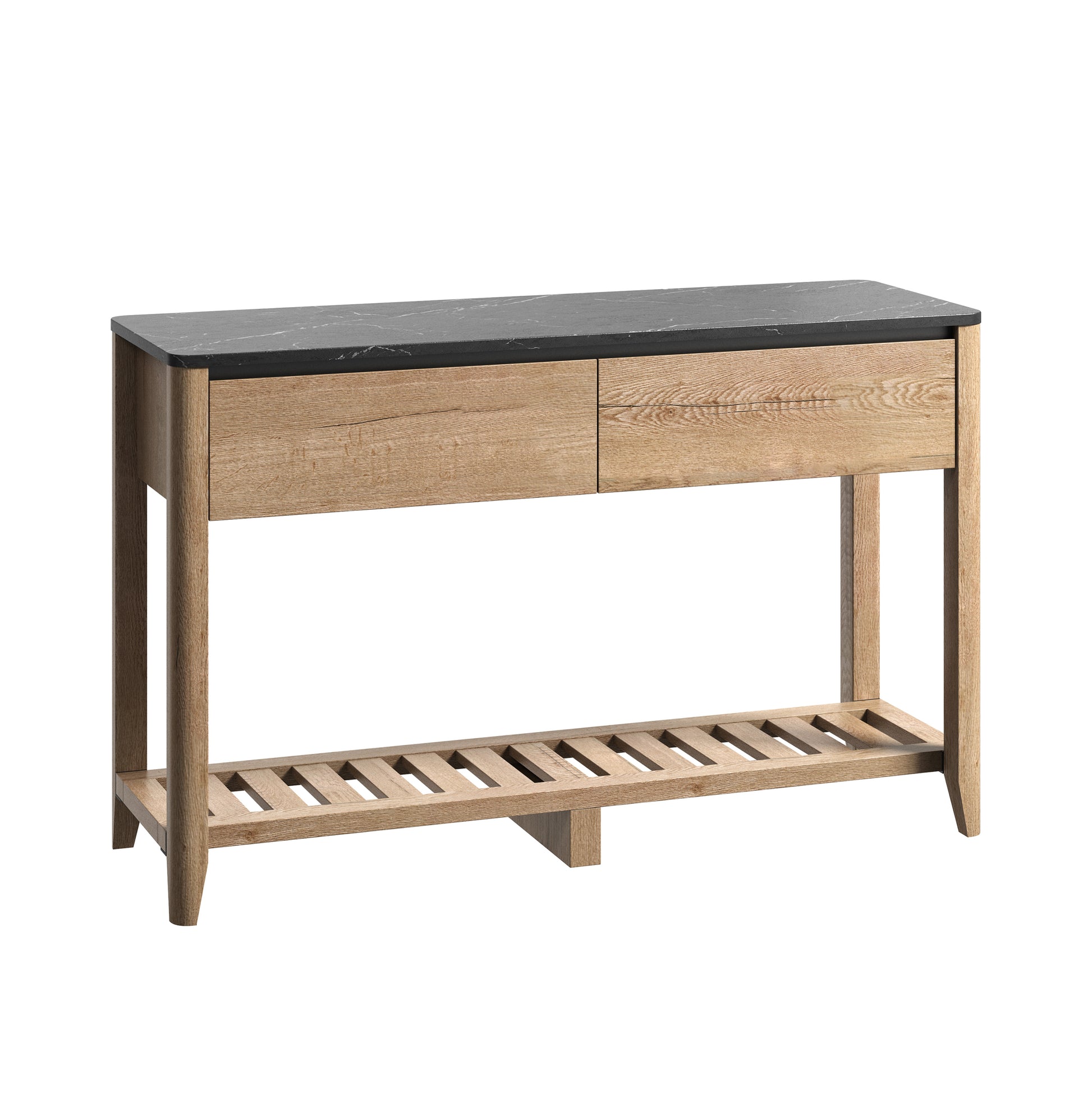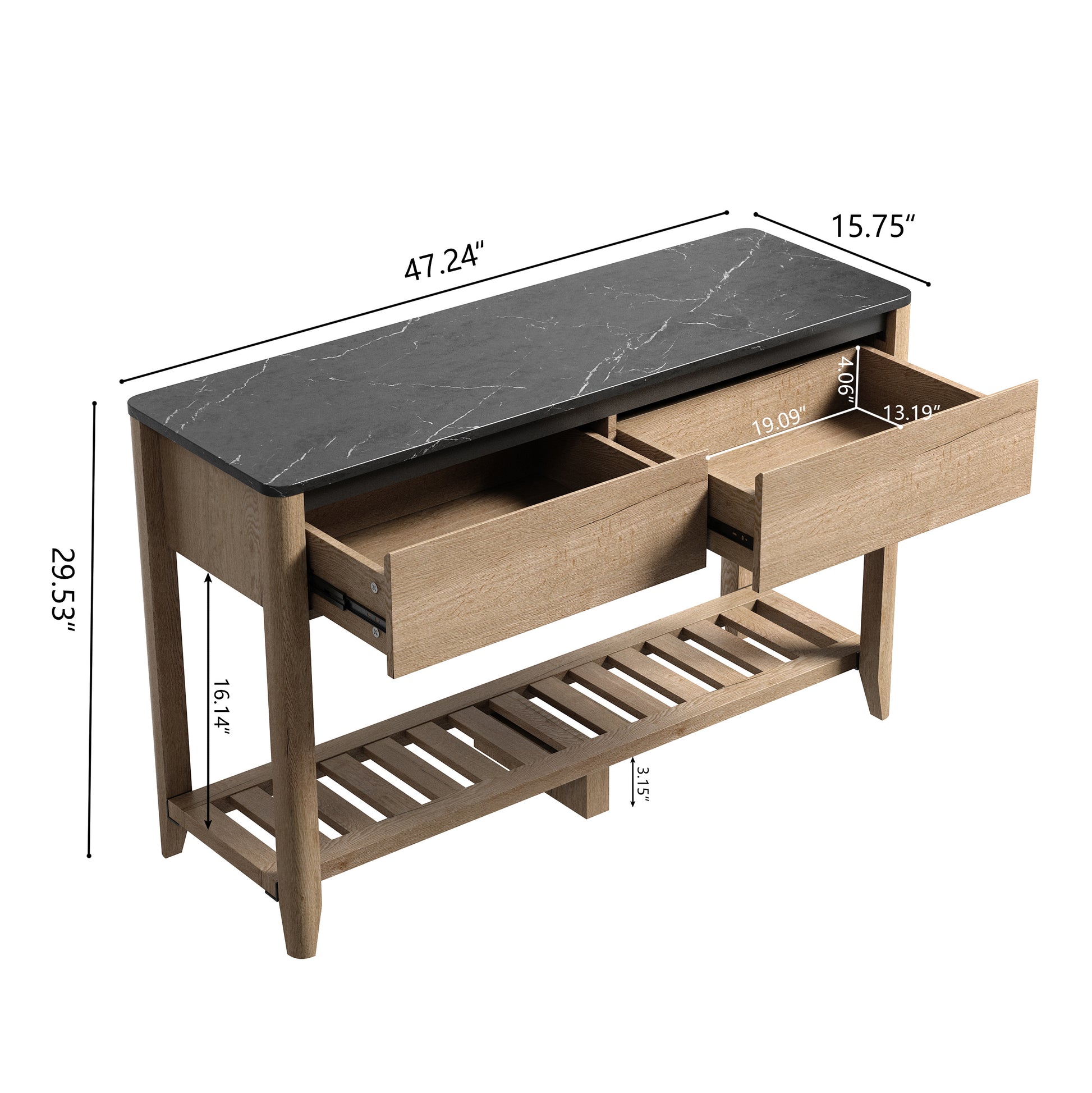 47 Inch Modern Farmhouse Double Drawers Console Table for Living Room or Entryway, Tobacco Wood and Black Marble Texture