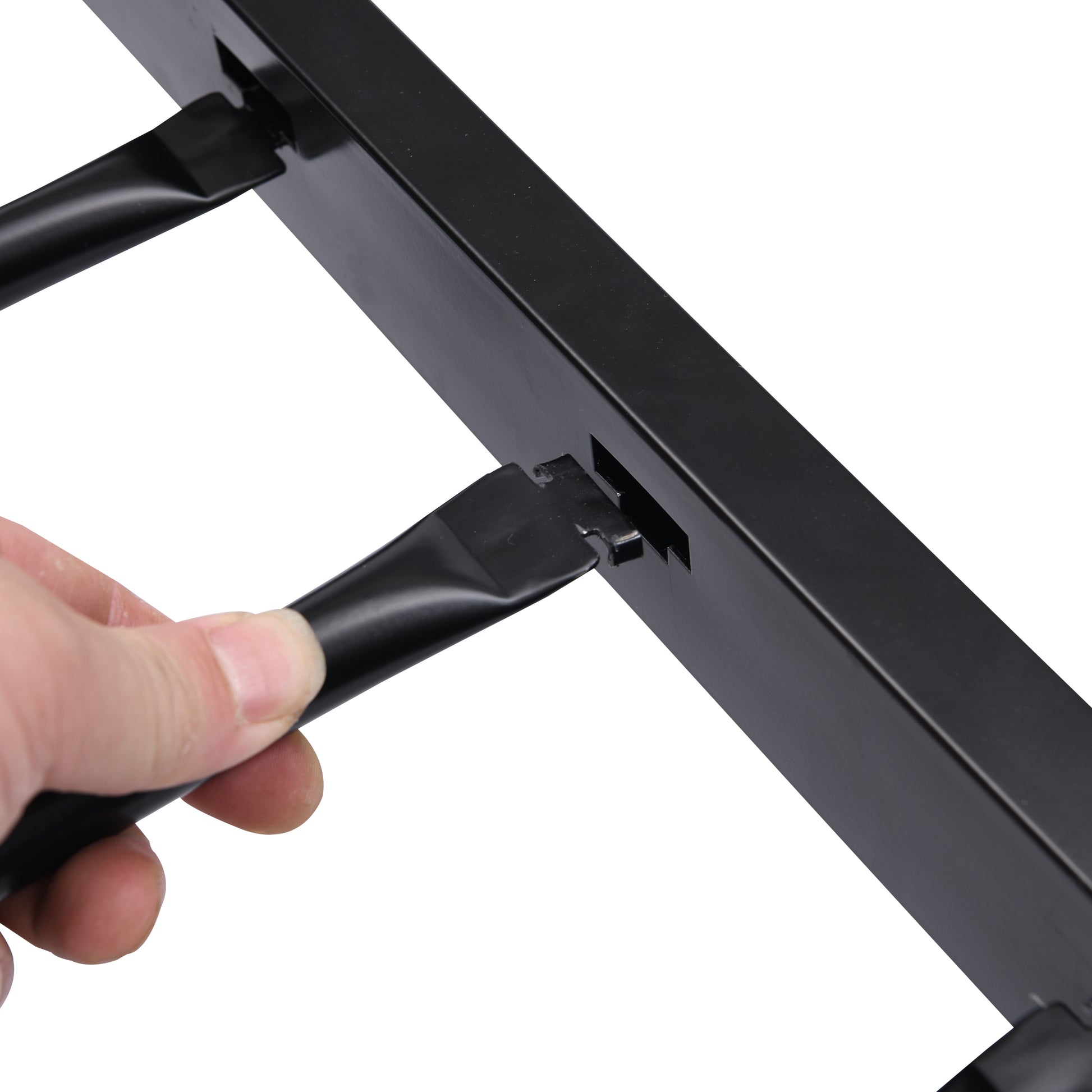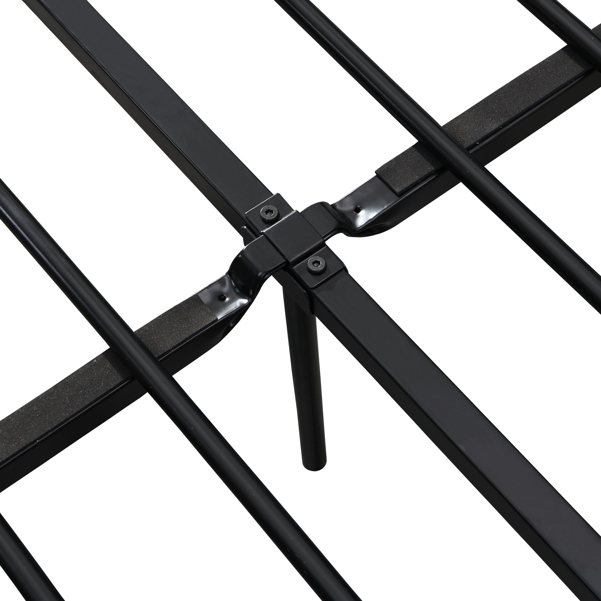 1. The bed frame is supported by 15 metal slats and 9 sturdy legs. The extremely high strength and safe design ensure durability and stability. It is firm and does not creak, and you can enjoy a sweet sleep. 2.The board is made of durable P2 grade MDF wood, which is strong, waterproof and scratch-resistant. The optimized and upgraded version of the square tube design bed frame and retro board add scenery to your bedroom. 3.On the headboard and footboard, there are predrilled holes to put the screws in.You don't need to drill the holes.Easy assembly. 4.High temperature treatment powder painting process to avoid paint peeling or rusting. Each part of the bed frame is welded firmly and fixed with heavy duty screws to prevent cracking. 5.We provide the rubber strip pressed the slats to prevent noise. Plastic foot plugs added to the bottom of the bed feet will never scratch your beloved floor.