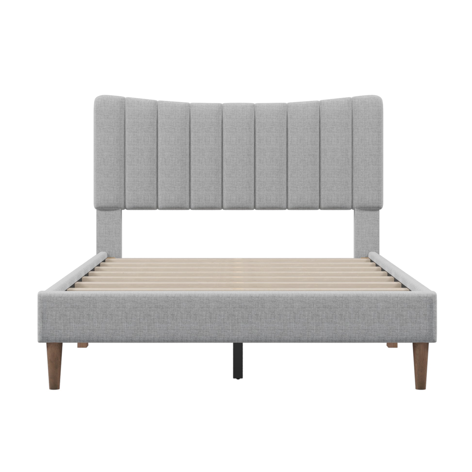 - The linen-inspired fabric finish with channel tufting on the headboard provides a timeless look.Plush padding in the tufted headboard make this upholstered bed your new go-to spot to sit back and relax.