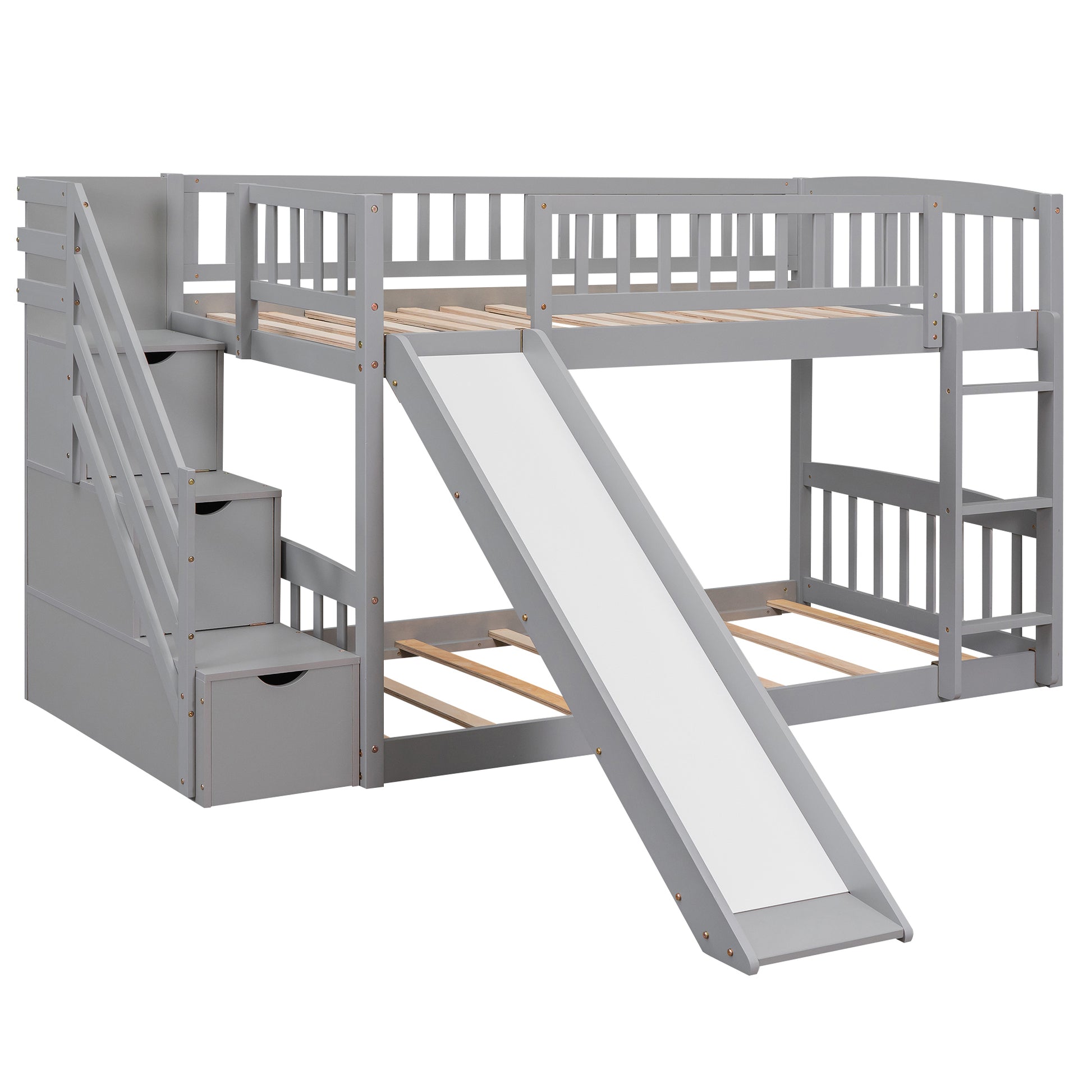 If you need extra sleeping space or you love sleepovers, this Stairway Twin-Over-Twin Bunk Bed with Drawers and Slide is perfect for your home. The build-in ladder and staircase provide easy access to the top bed, and the two drawers located beneath the attached staircase provide ample storage for your toys and bedding. For added extra fun, slide is included and can be put either left or right. The 11.9" tall guardrails to keep your safe on the top bunk. High-quality, solid pine legs and a strong, durable frame ensures stability and durability for long-term use. Slat kit included so box springs are not required. This bunk bed is designed with a clean silhouette and a hue of elegance. It suits all styles of home decoration, and completes the look of any bedroom.
