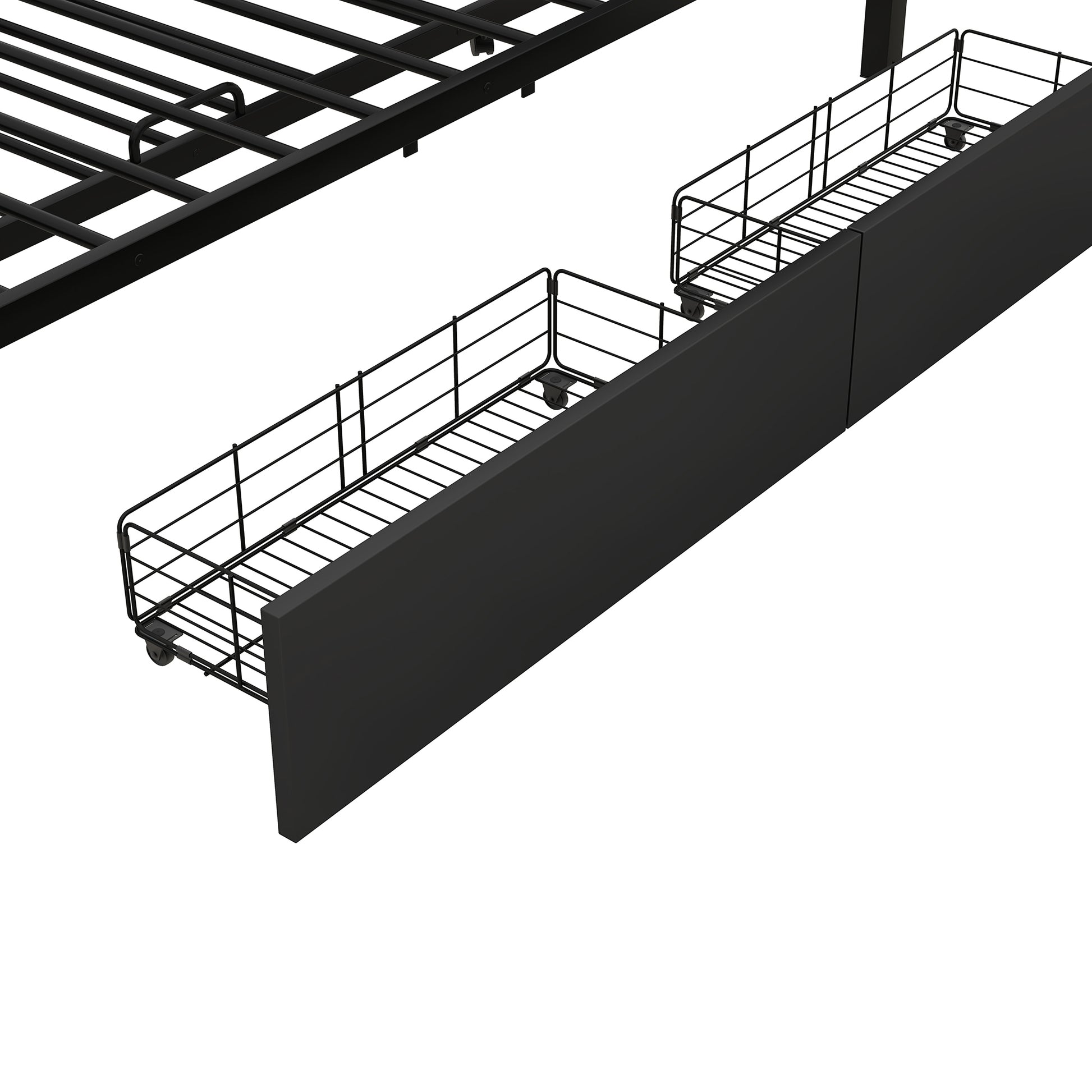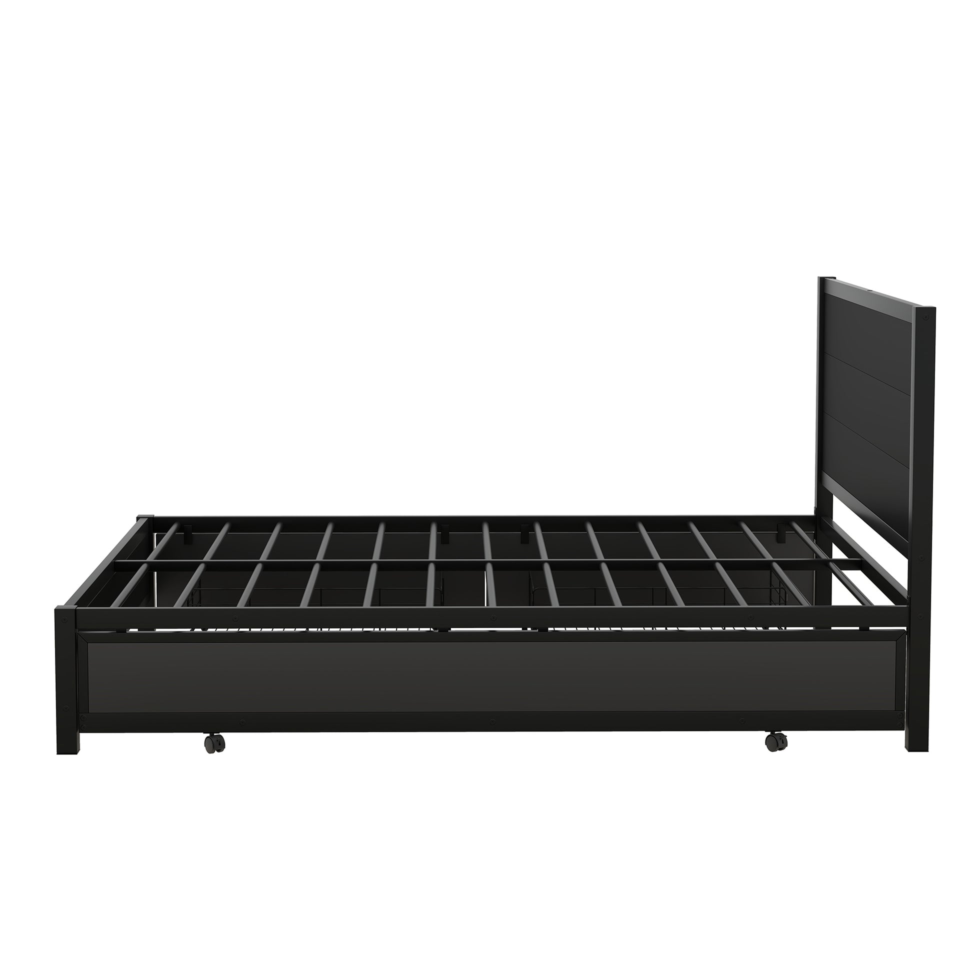 Metal Queen Size Storage Platform Bed with Twin Size Trundle and 2 Drawers, Black