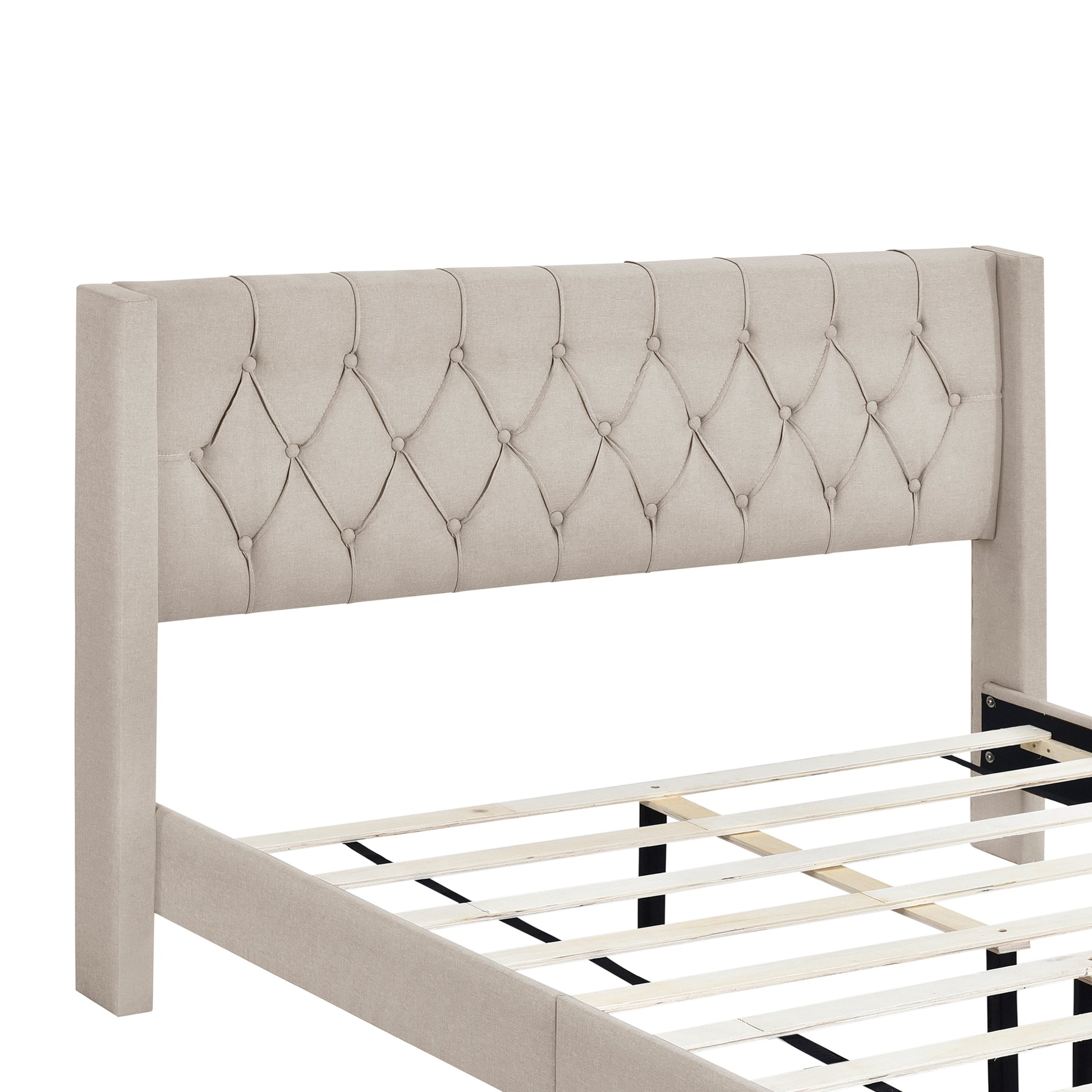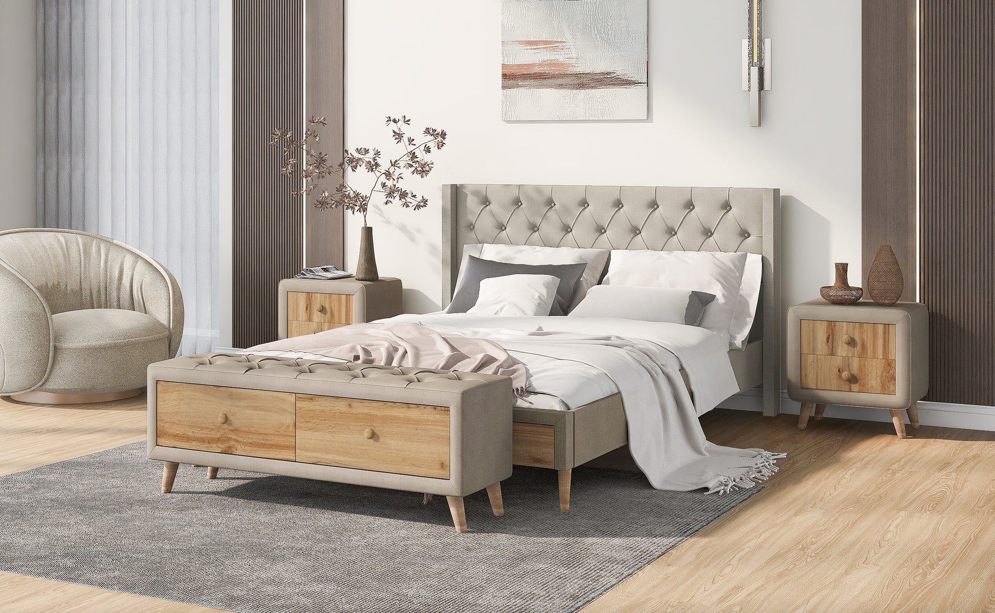 4-Pieces Bedroom Sets Queen Size Upholstered Platform Bed with Two Nightstands and Storage Bench-Beige