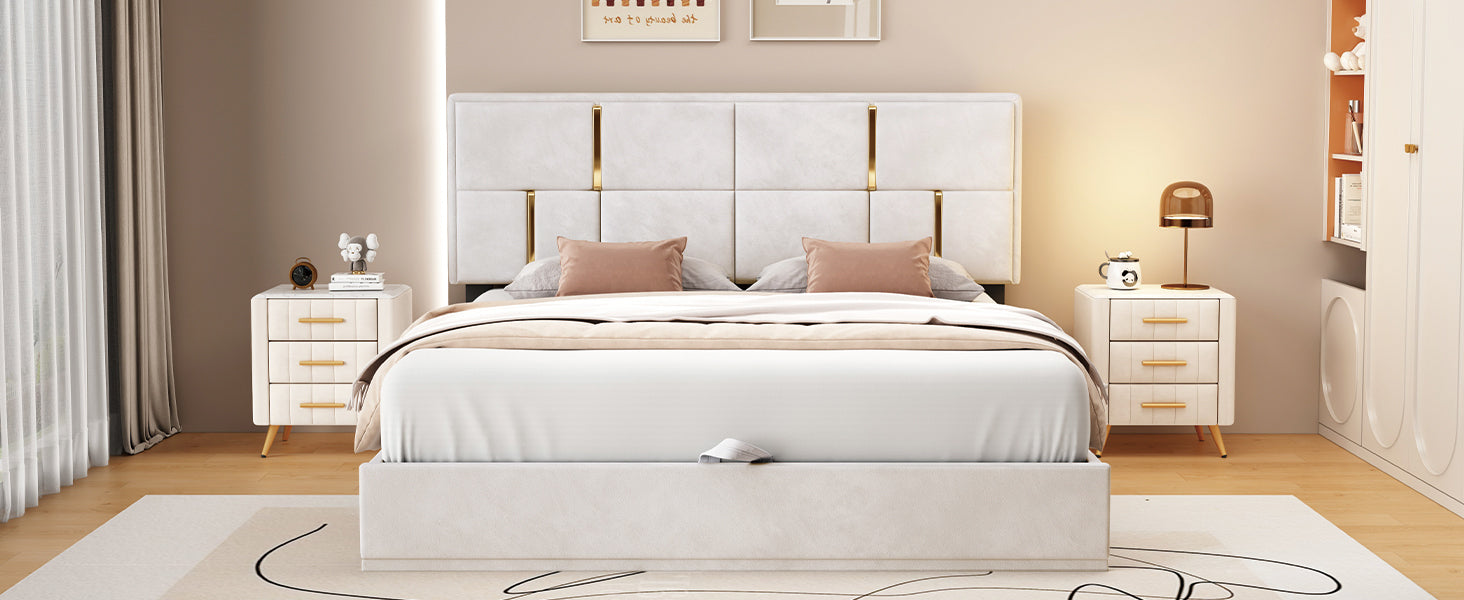 Upholstered in carefully-selected soft fabric, with gold decoration on the headboard, this platform bed not only suits any home décor, but is timeless in its design. The soft textile bedhead creates coziness, while the single color of the design creates versatility.The hydraulic storage system underneath the mattress is perfect for you to store quilts, bed sheets and other necessities. Functional and aesthetic, this bed will enhance any bedroom.