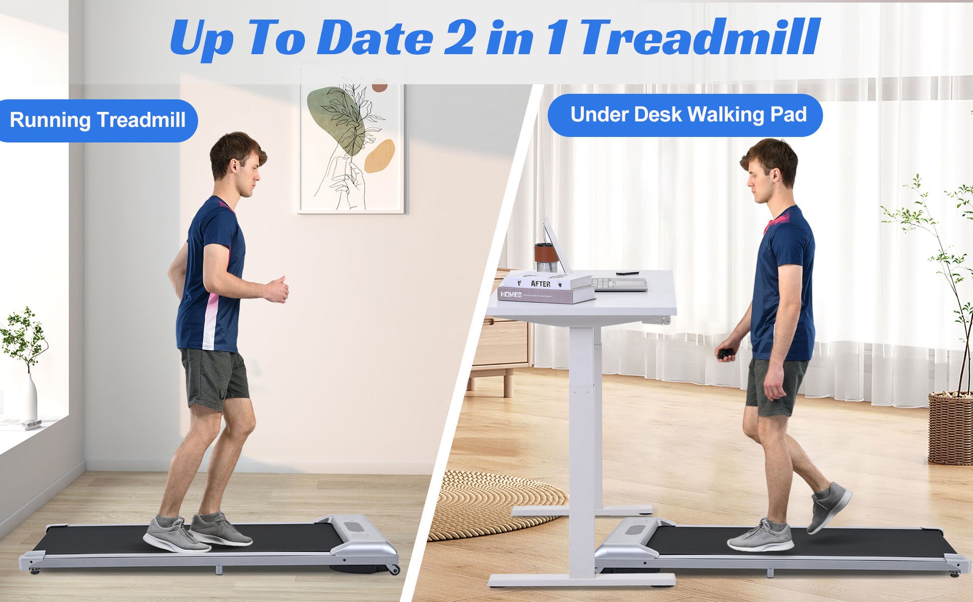 No Assemble & Space-saving: Unlike the traditional treadmills, our walking and running 2 in 1 treadmill is no assemble needed, designed to be lightweight, portable and easy to store under the bed or desk. Wheels at the bottom are for easy transportation.