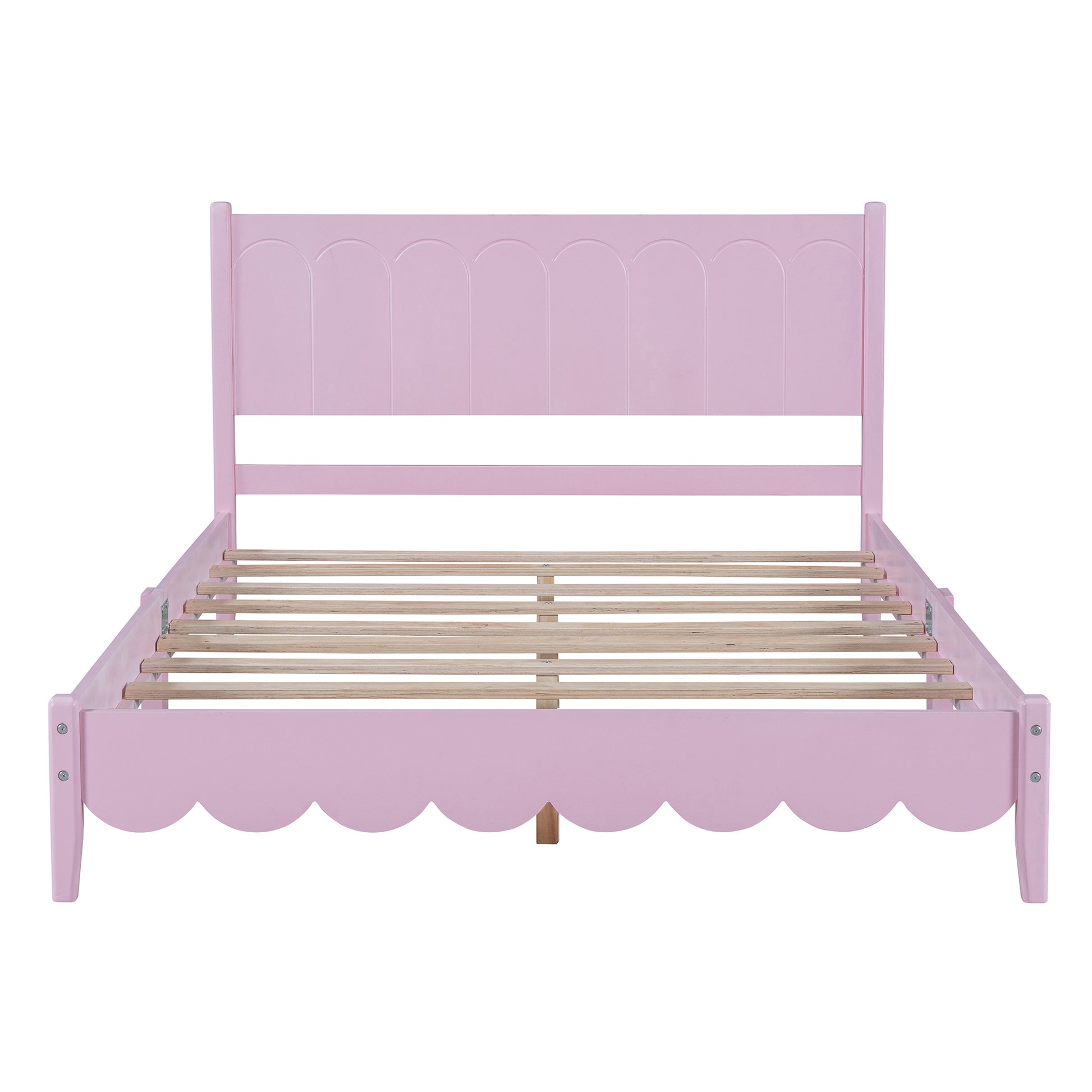 Full Size Wood Platform Bed Frame, Retro Style Bed with Rectangular Headboard, Pink