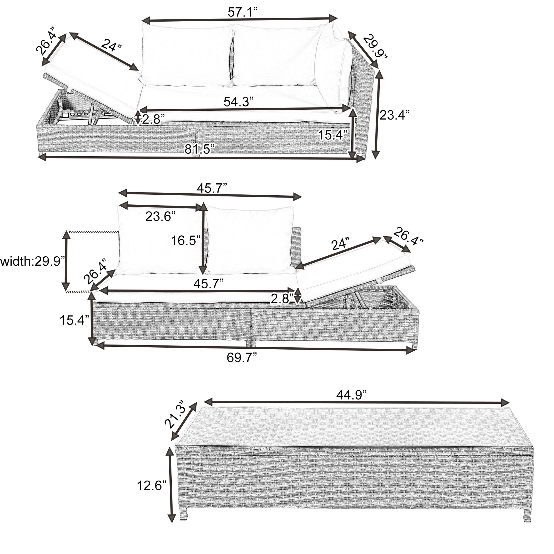 - [Dimension&Warranty] Sofa with Arm: 81.5x29.9x23.4inch(LXWXH); Sofa without Arm: 69.7x29.9x23.4inch(LXWXH); Seat to Ground: 15.4inch(cushion thickness included); Table: 44.9x21.3x12.6inch(LXWXH); For more size, please refer to the size image. 3 boxes in total which may not come together.