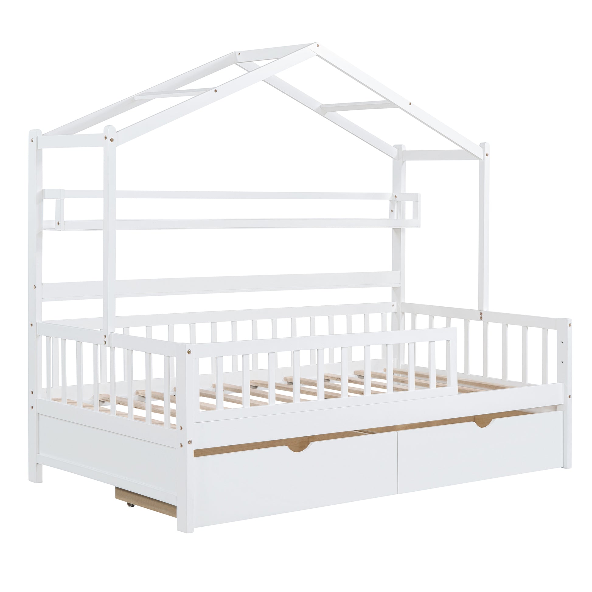 Wooden Twin Size House Bed with 2 Drawers,Kids Bed with Storage Shelf, White
