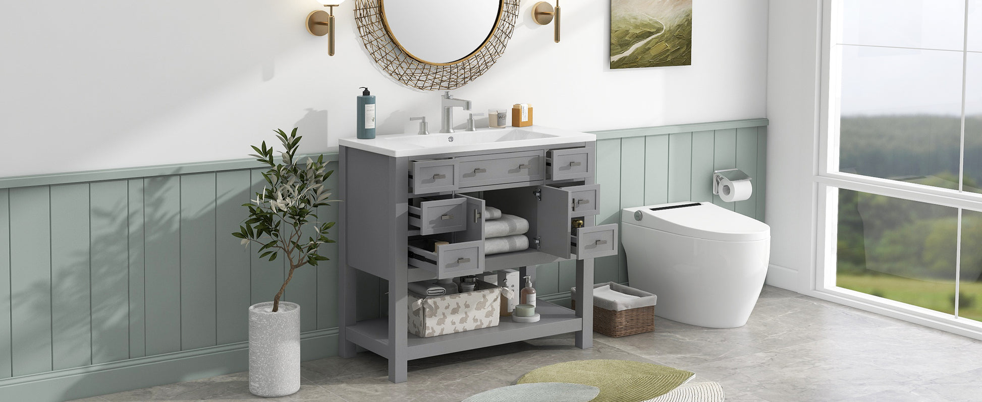 - [ Multi-Purpose Cabinet & Concealed Storage ] Are you looking for stylish and functional storage solutions for your bathroom? Our bathroom vanity provide ample space for all your toiletries and bathroom essentials. The combination of the cabinet body and the drawer perfectly stores all kinds of bathroom products and keeps the necessities away from water stains and dust. Soft-close doors and drawer fronts feature a water-resistant paint finish for durability.