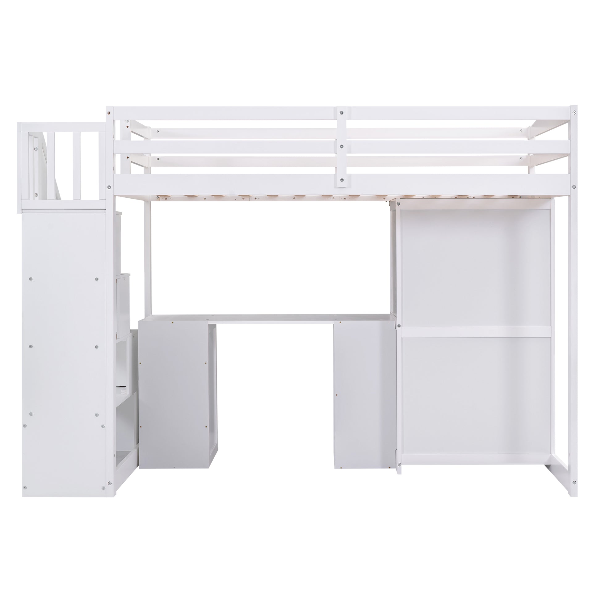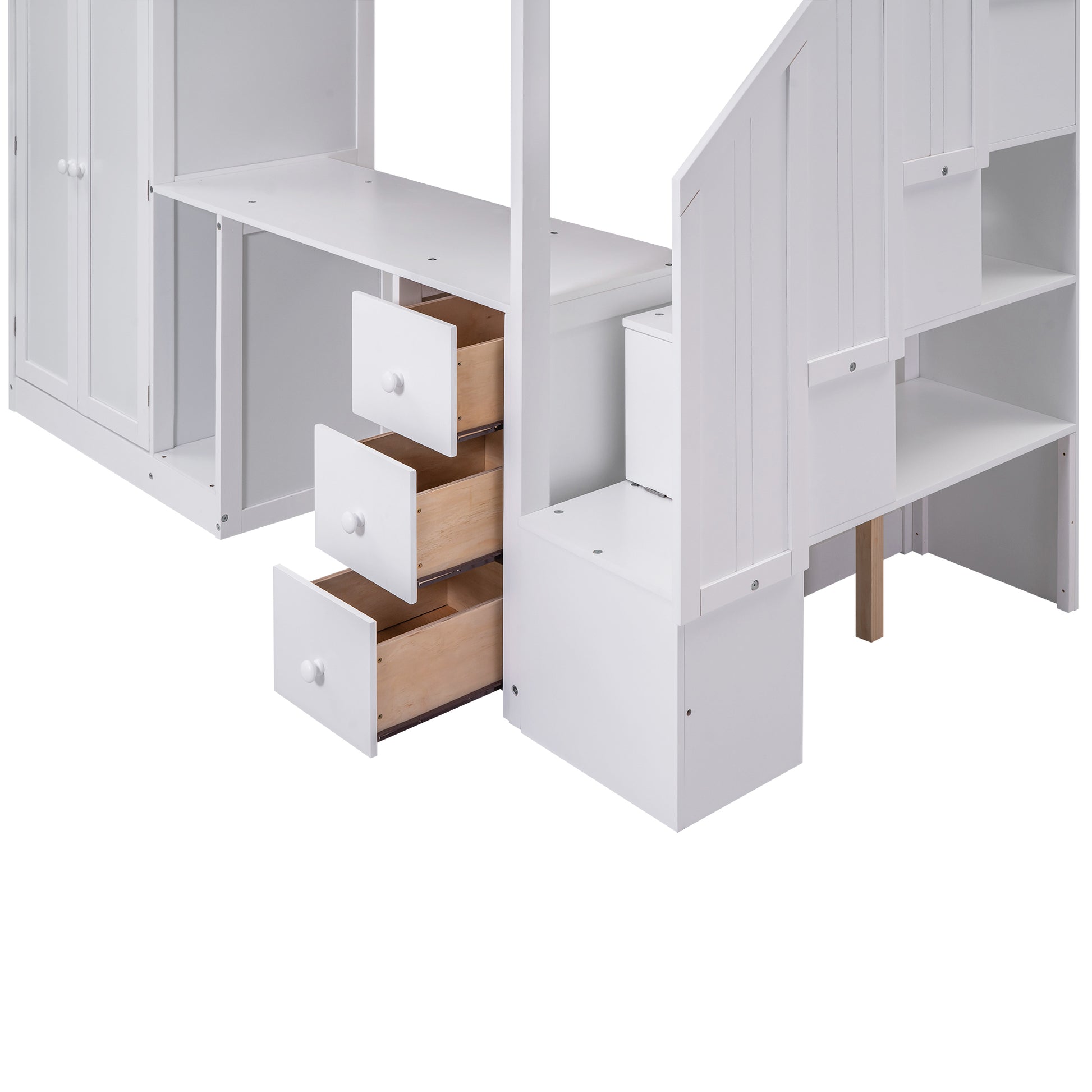 Twin Size Loft Bed with Wardrobe and Staircase, Desk and Storage Drawers and Cabinet in 1, White