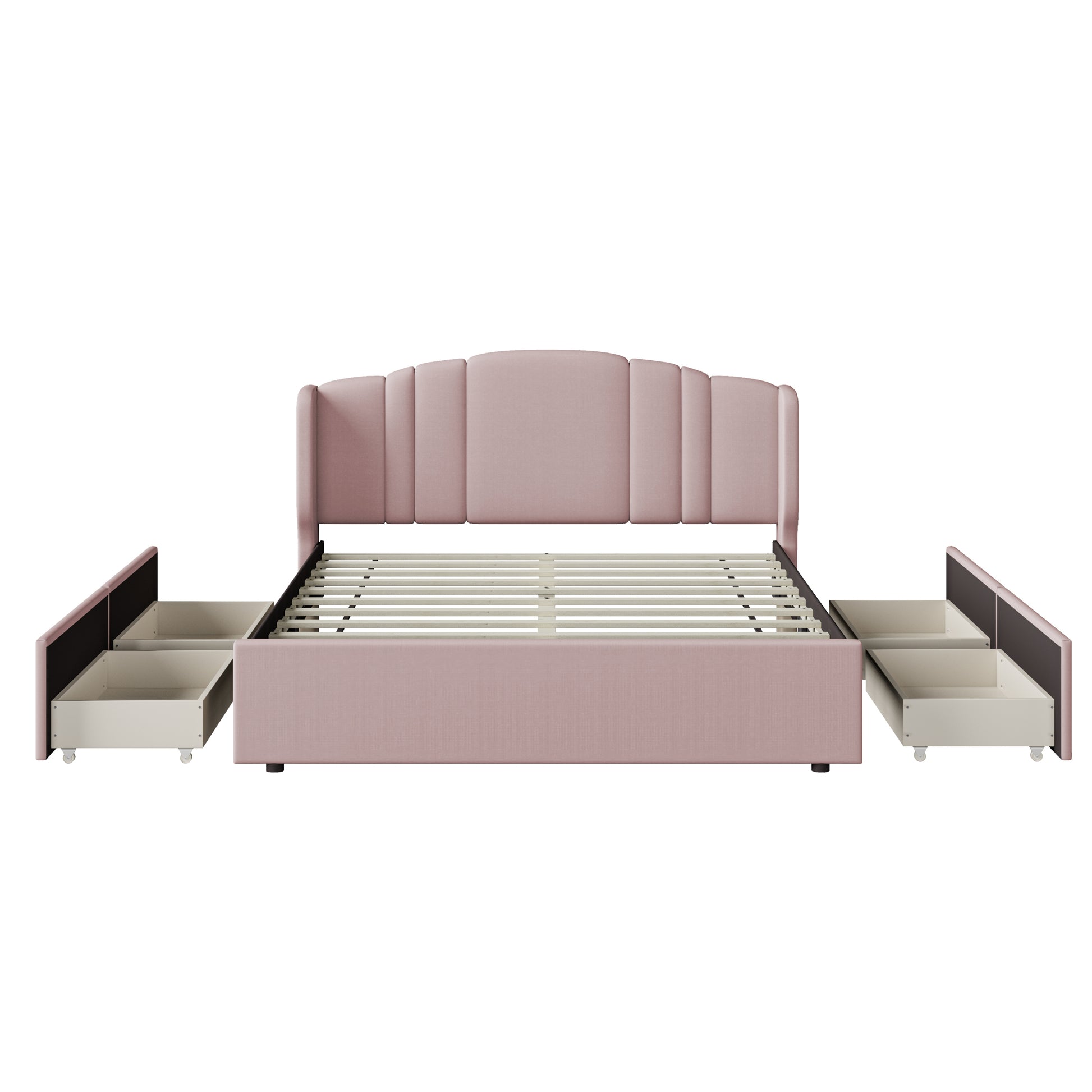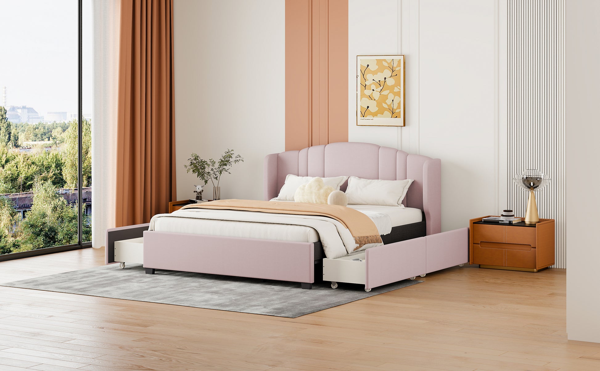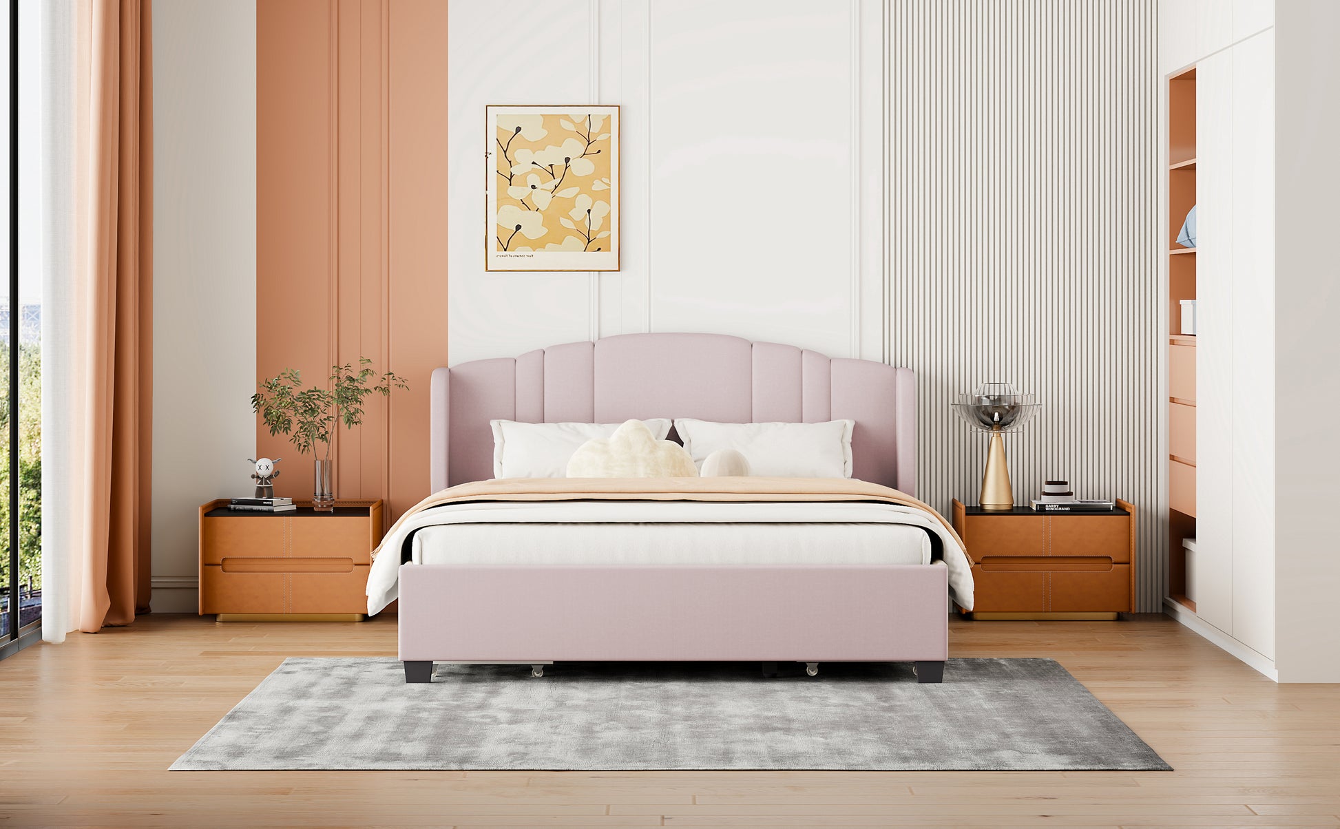 Upholstered Platform Bed with Wingback Headboard and 4 Drawers, No Box Spring Needed, Linen Fabric, Queen Size Pink