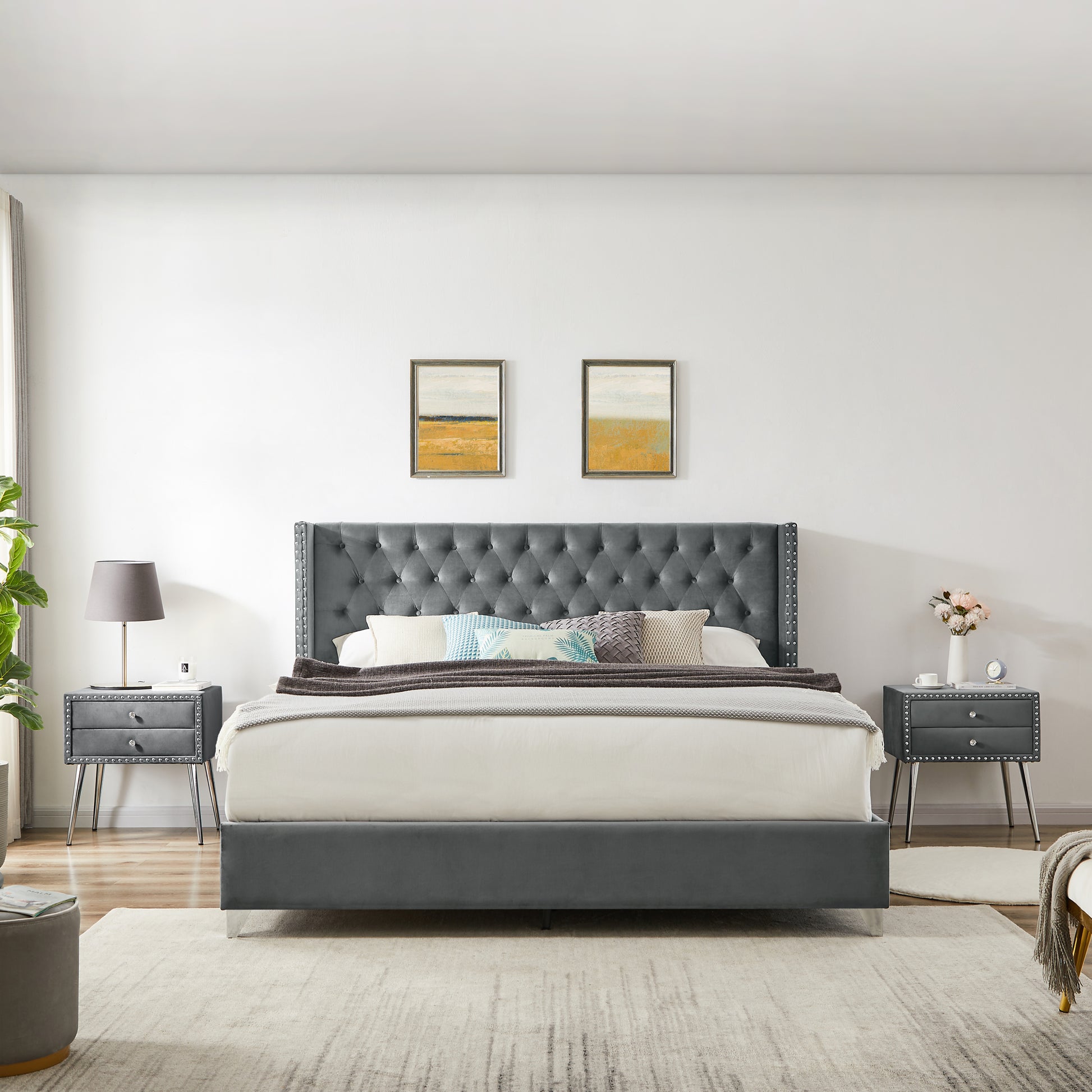 B100S King bed with two nightstands, Button designed Headboard,strong wooden slats + metal legs with Electroplate
