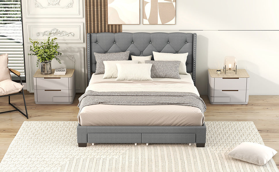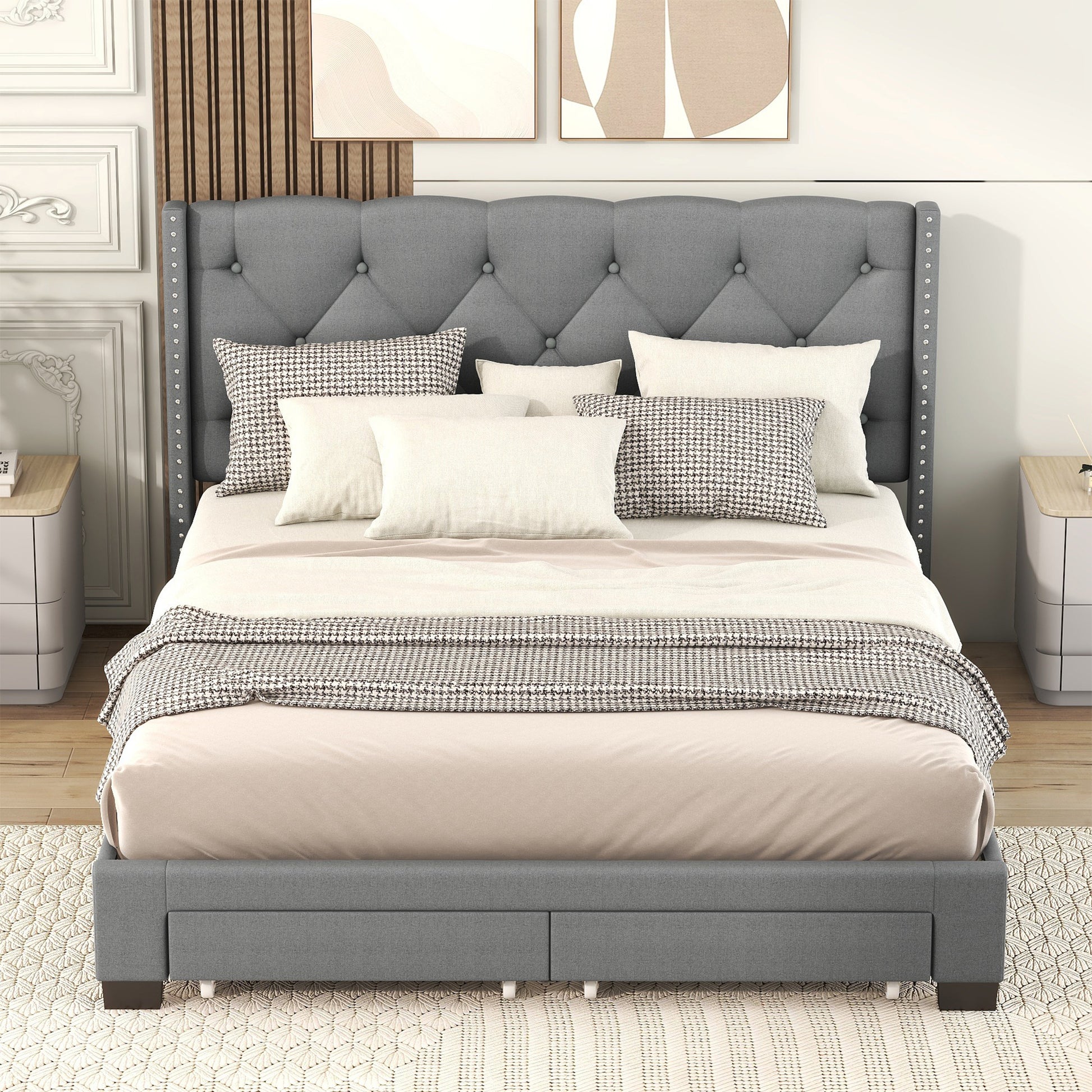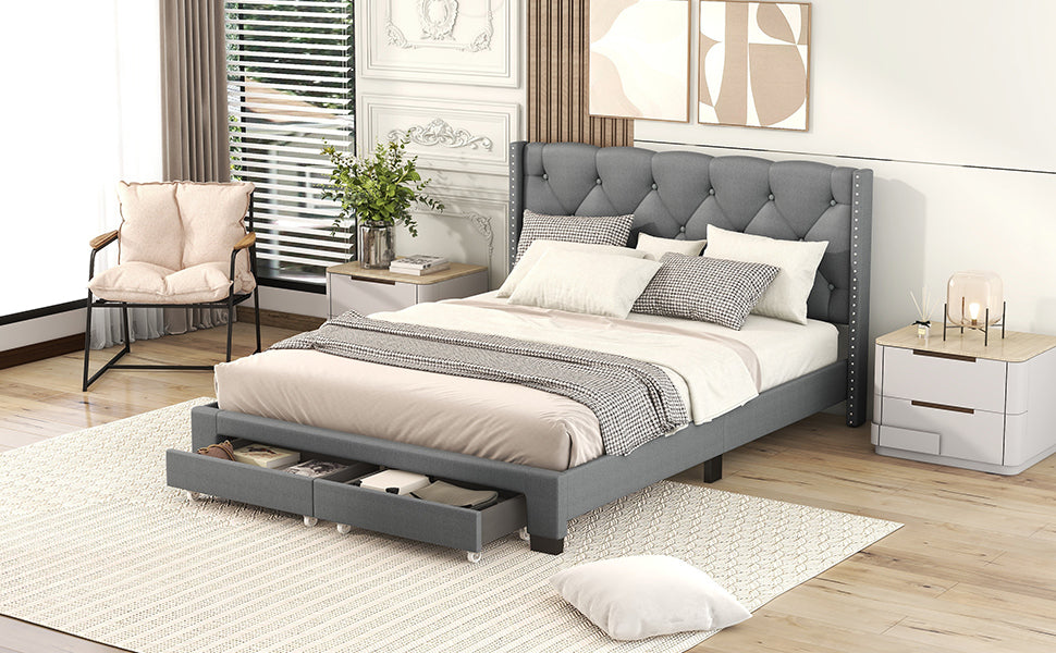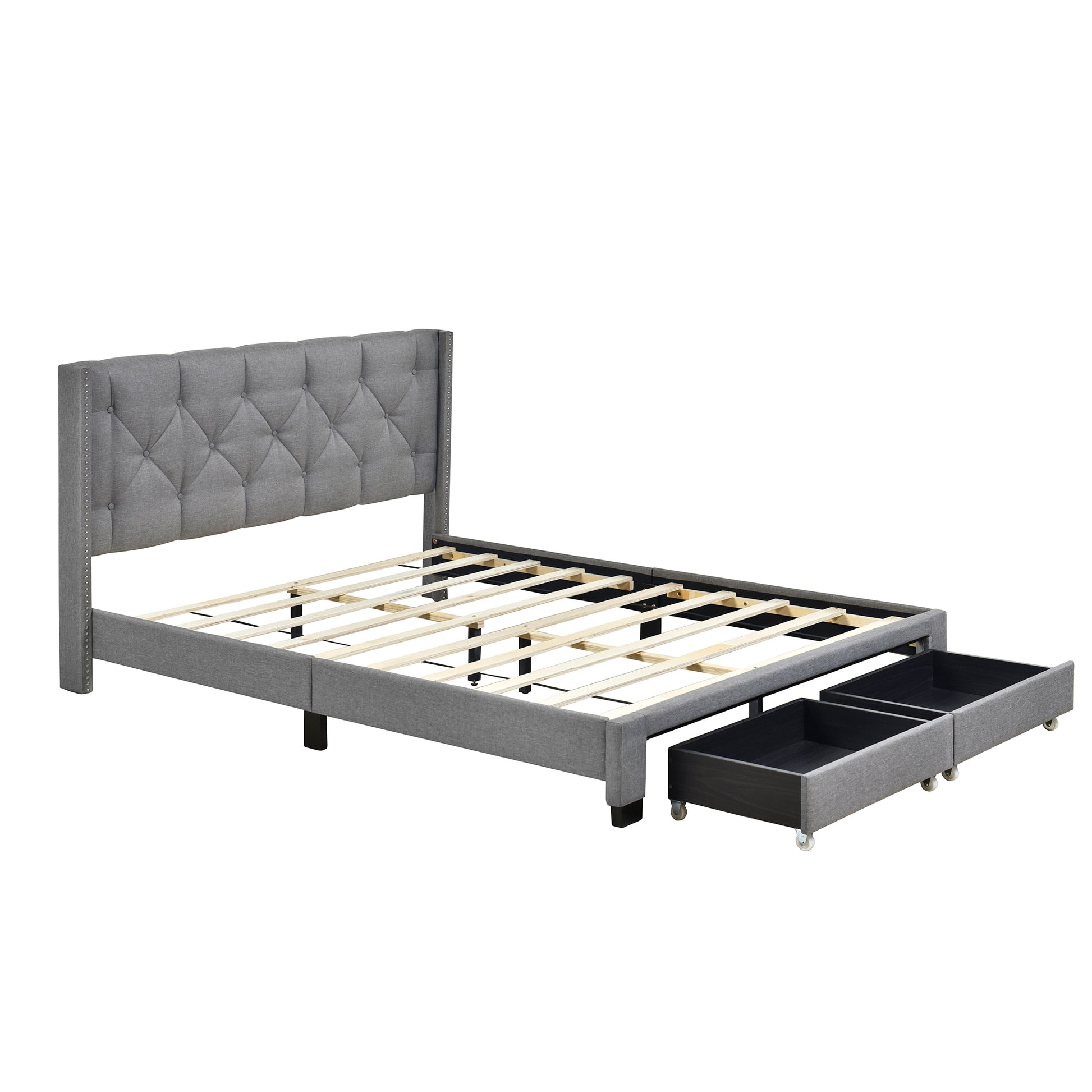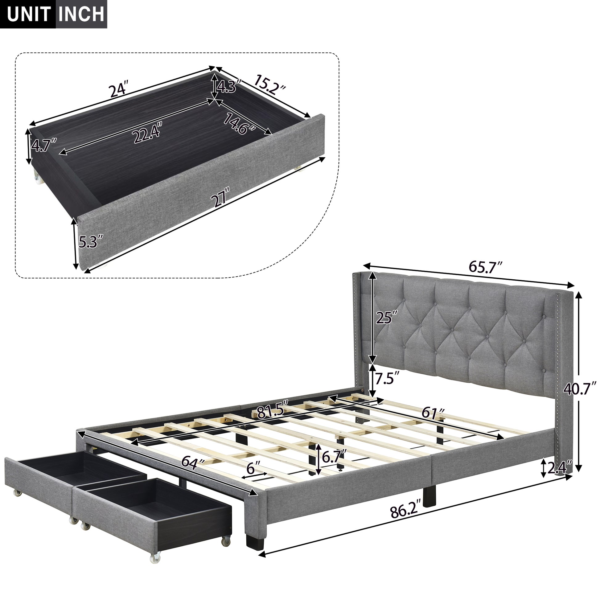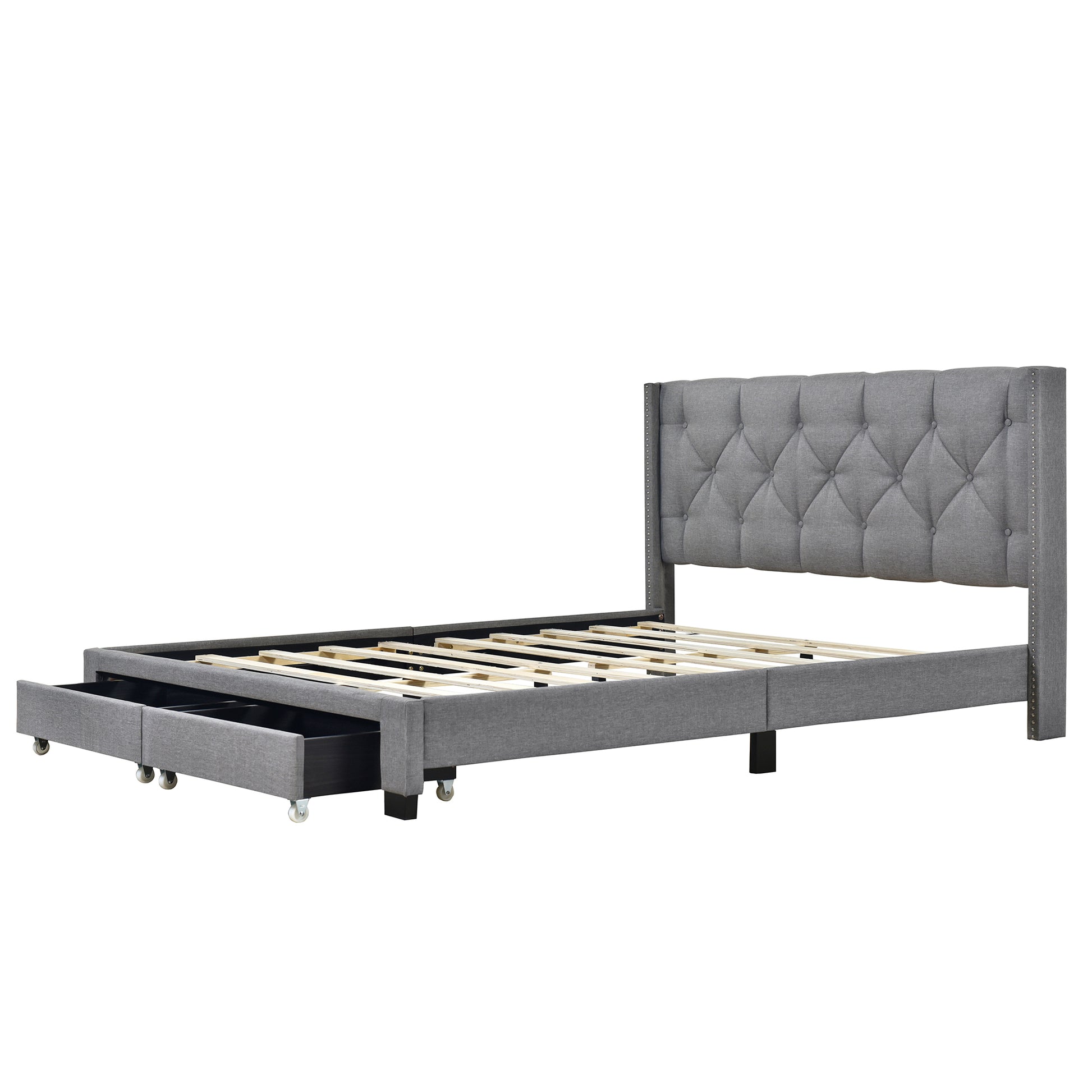Queen Size Storage Bed Linen Upholstered Platform Bed with Two Drawers - Gray