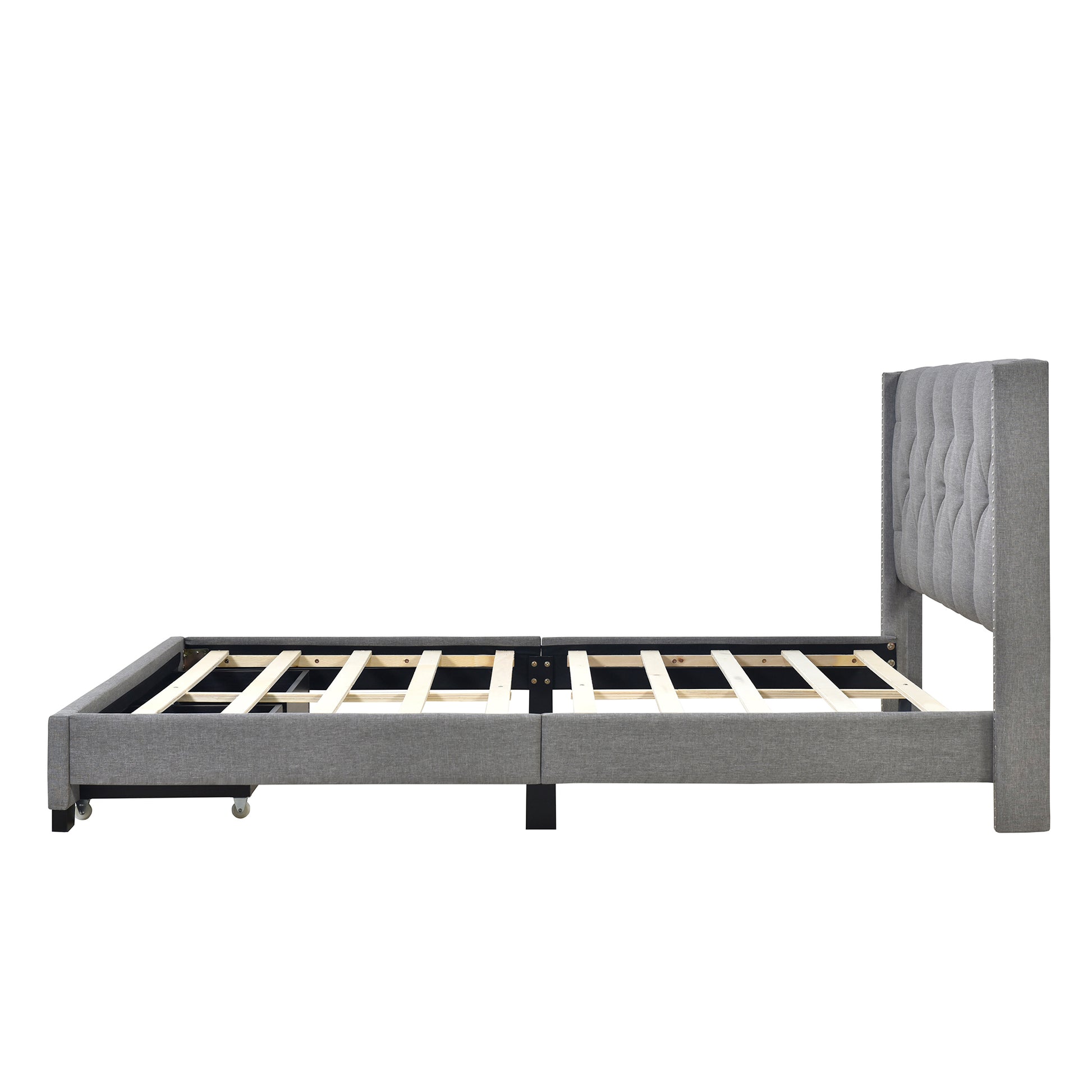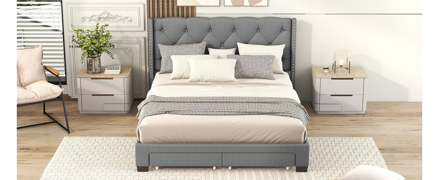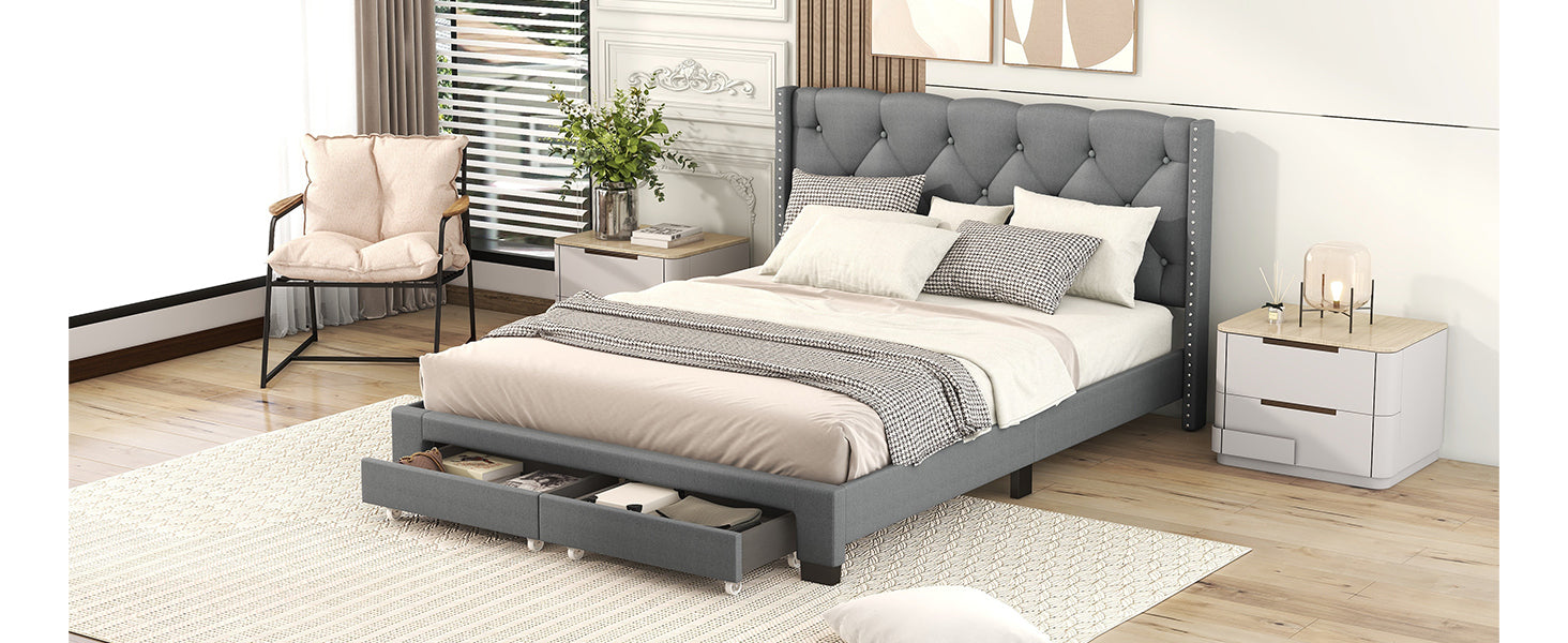 This beautiful Upholstered Platform Bed features button tufted upholstered headboard that adds a contemporary chic look to your bedroom and filled in thick foam to add extra comfort. Sturdy wood frame construction and a wooden slat system to add extra stability and safety. Despite its size and solidity, this piece comes with hardware and instructions included and anyone can assemble it, without a problem. The upholstered platform bed with two drawers can easily be pulled in and out for maximum storage space, perfect for organizing anything from clothes and bed linens to toys and games. Good design should be accessible to all.