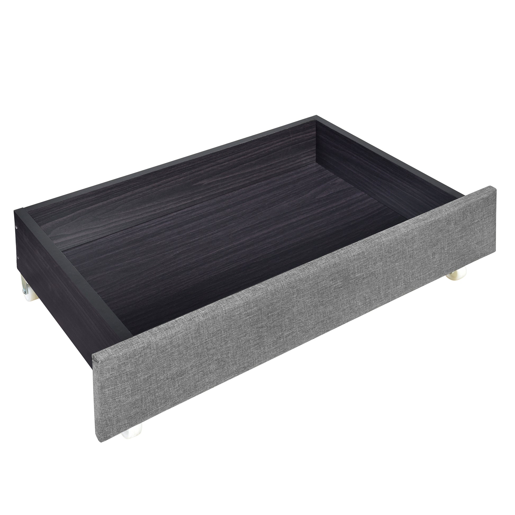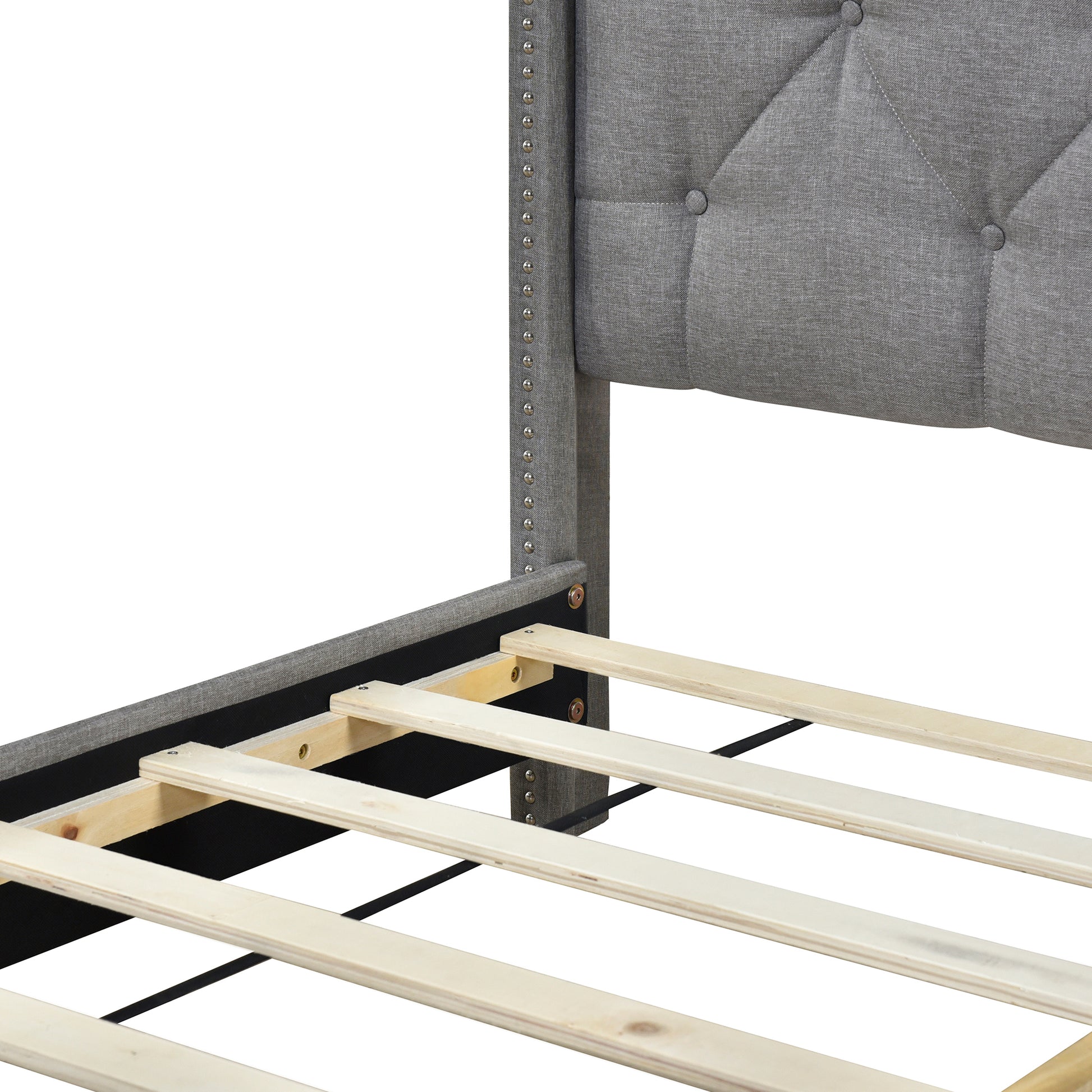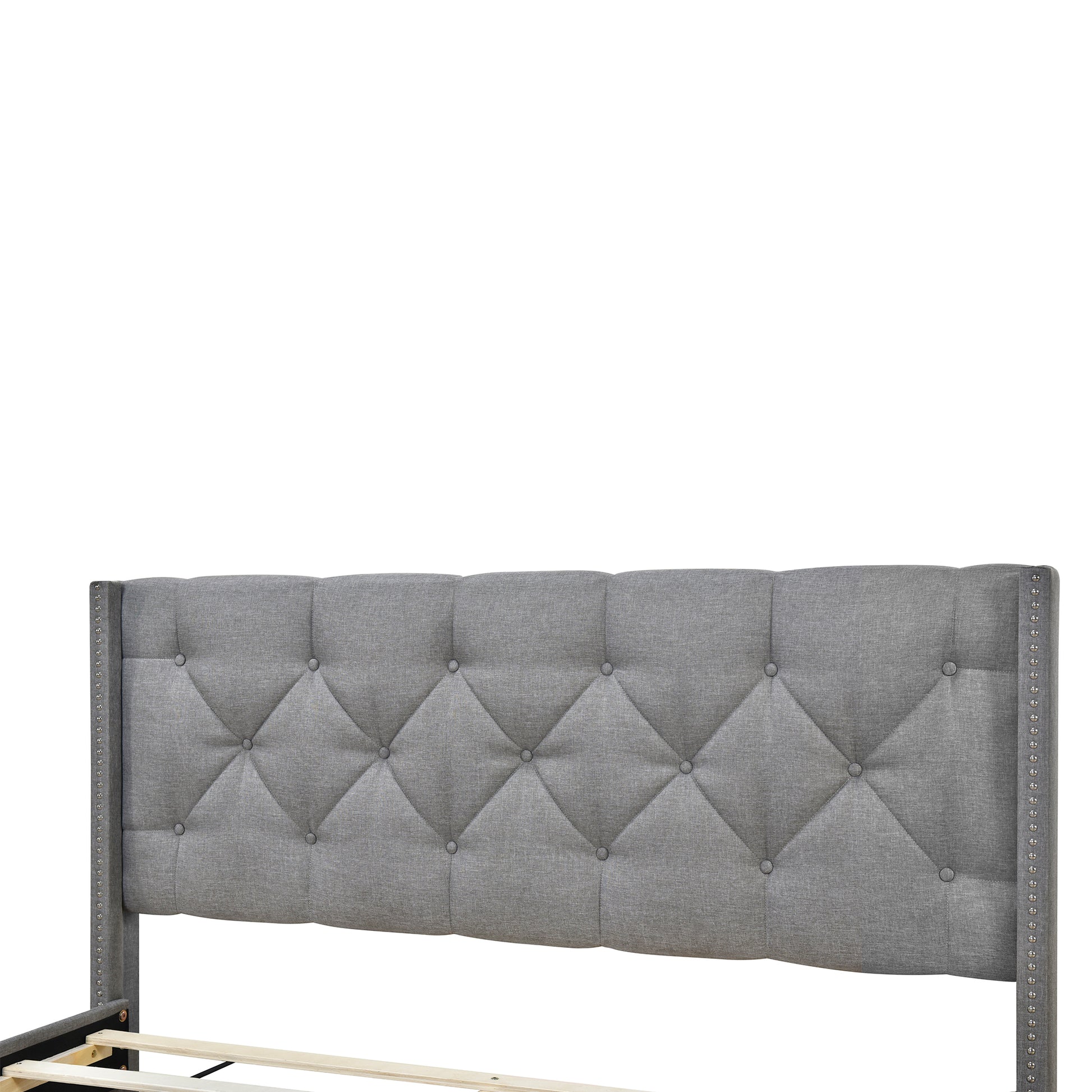 This beautiful Upholstered Platform Bed features button tufted upholstered headboard that adds a contemporary chic look to your bedroom and filled in thick foam to add extra comfort. Sturdy wood frame construction and a wooden slat system to add extra stability and safety. Despite its size and solidity, this piece comes with hardware and instructions included and anyone can assemble it, without a problem. The upholstered platform bed with two drawers can easily be pulled in and out for maximum storage space, perfect for organizing anything from clothes and bed linens to toys and games. Good design should be accessible to all.
