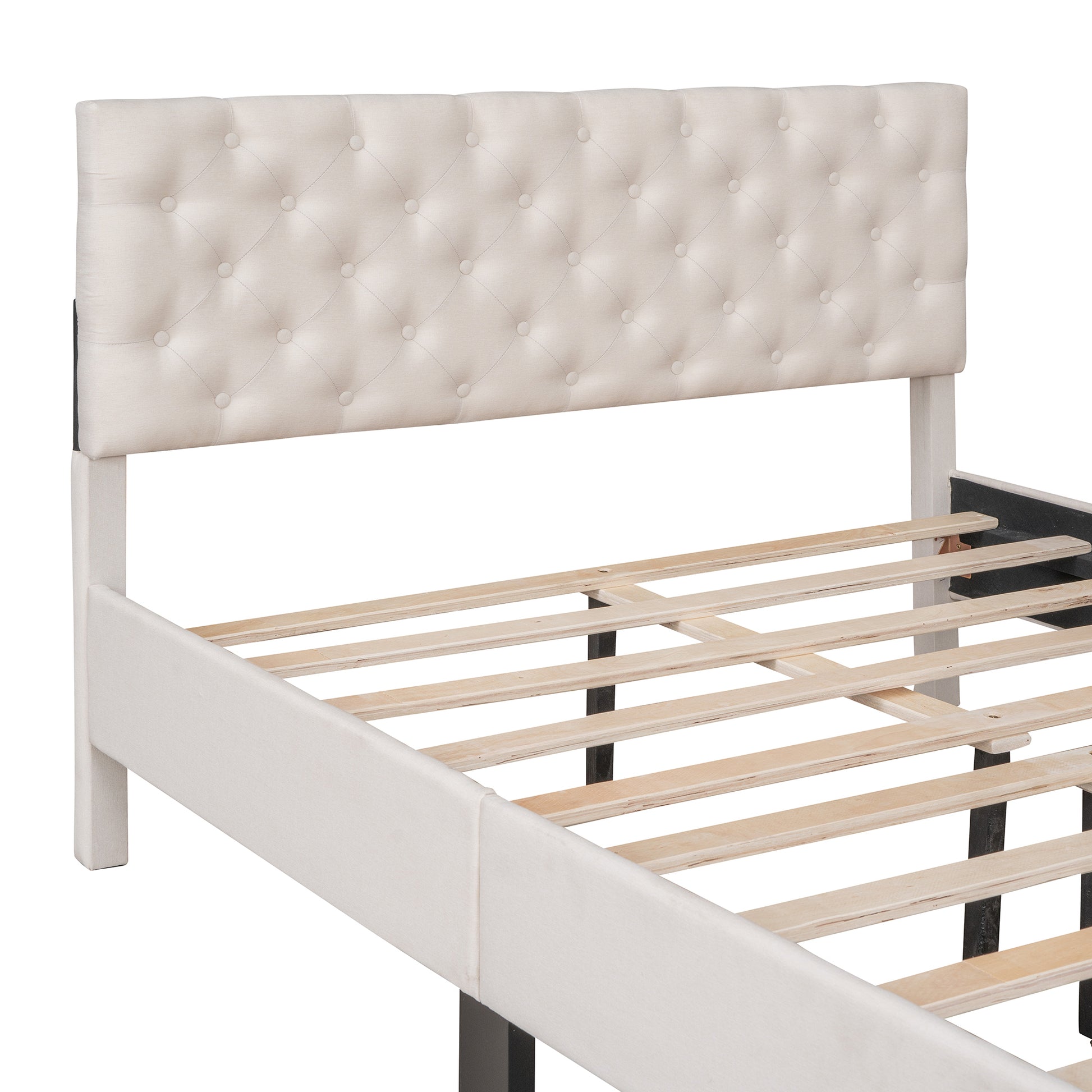 This beautiful Upholstered Platform Bed features button tufted upholstered headboard that adds a contemporary chic look to your bedroom and filled in thick foam to add extra comfort.Sturdy wood frame construction and a wooden slat system to add extra stability and safety. You don't need to buy the box spring because this twin bed equipped with 10 slats.