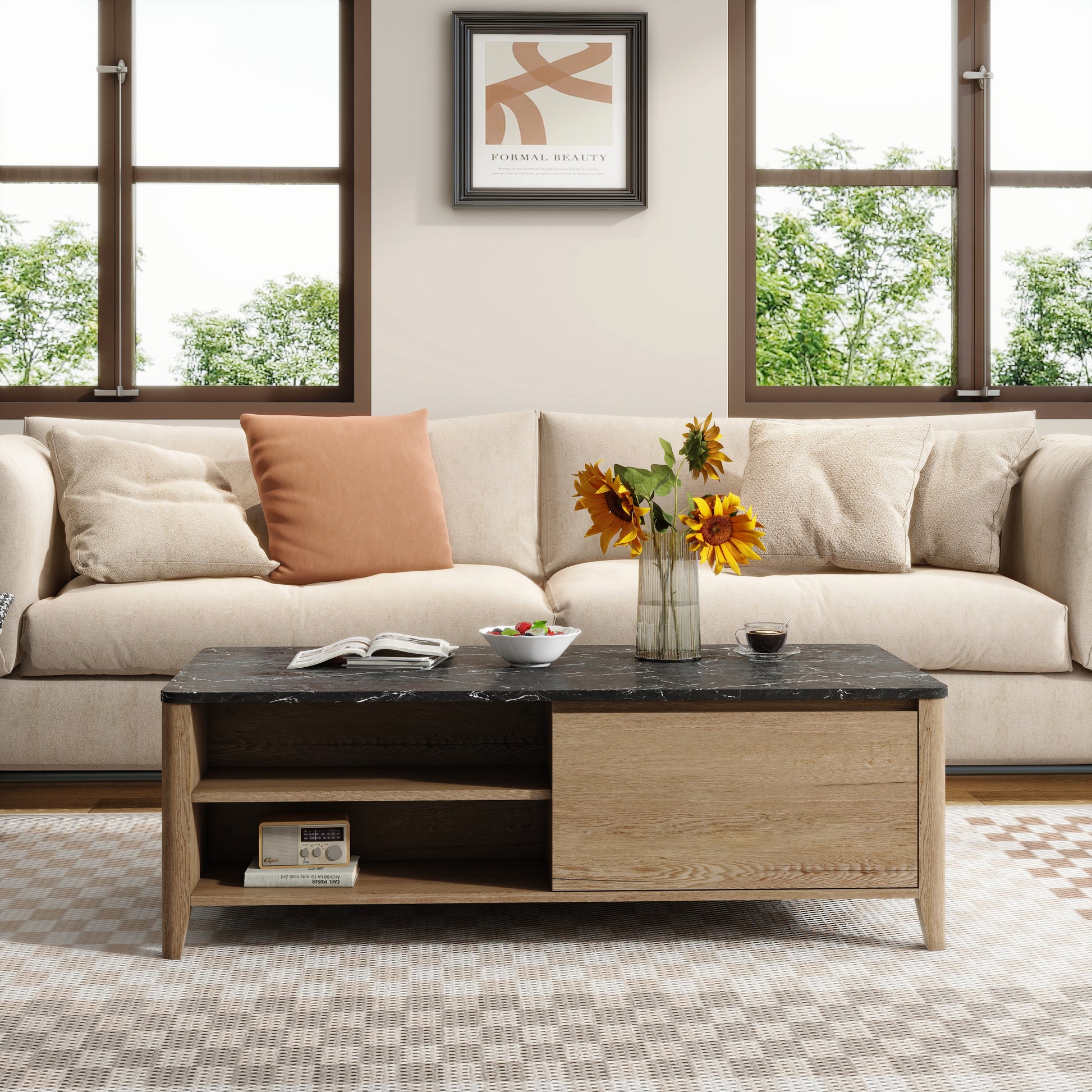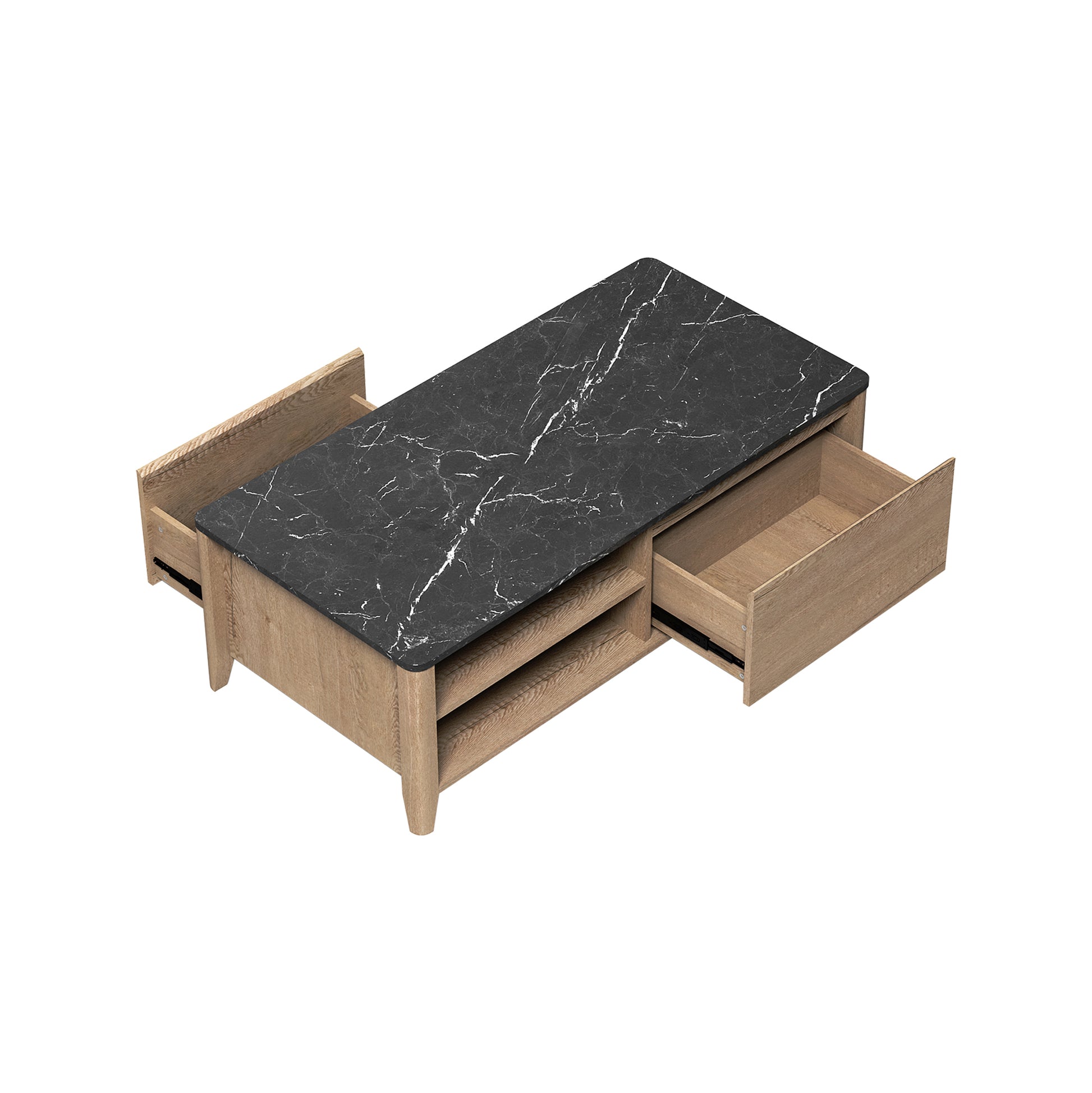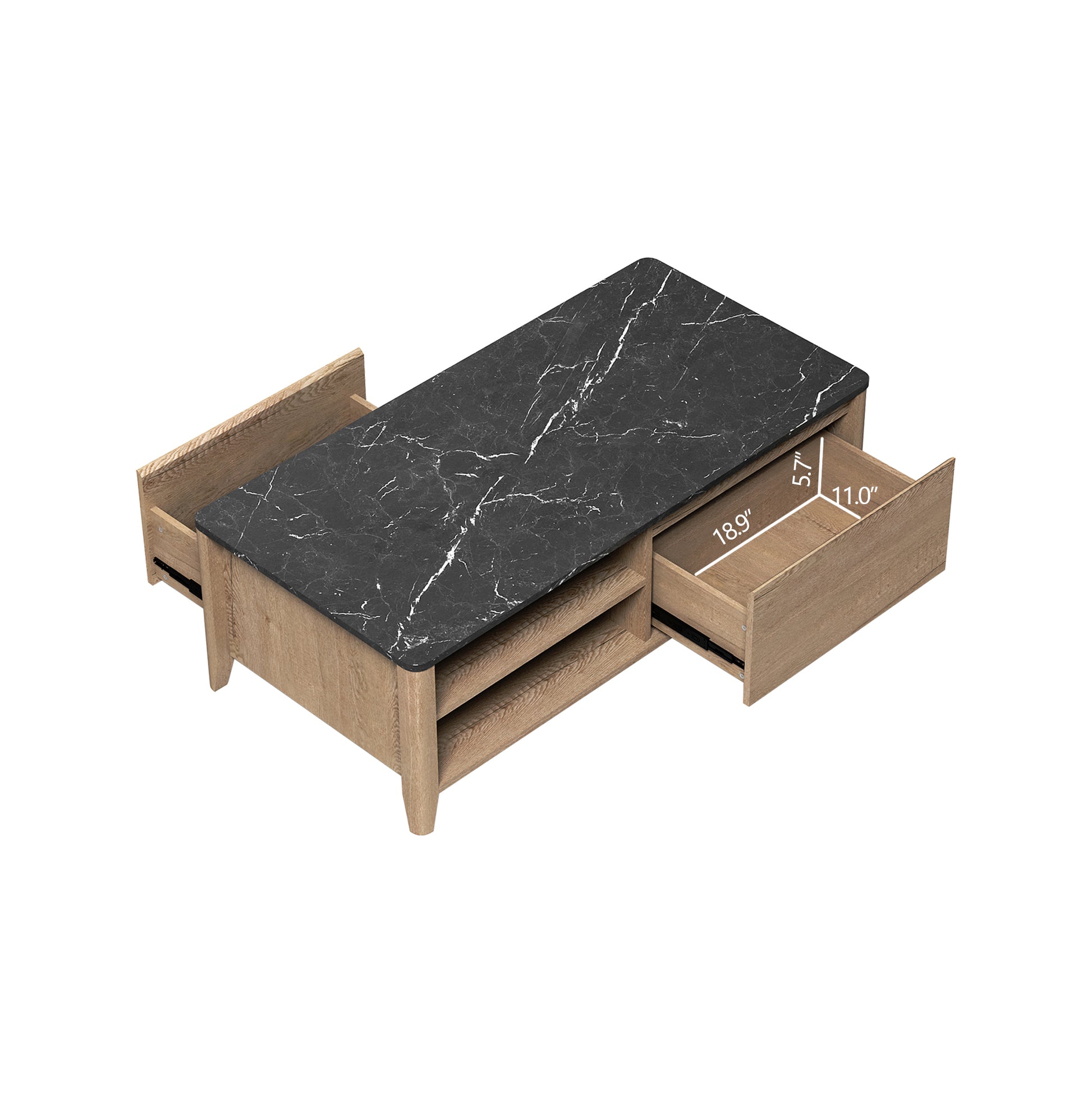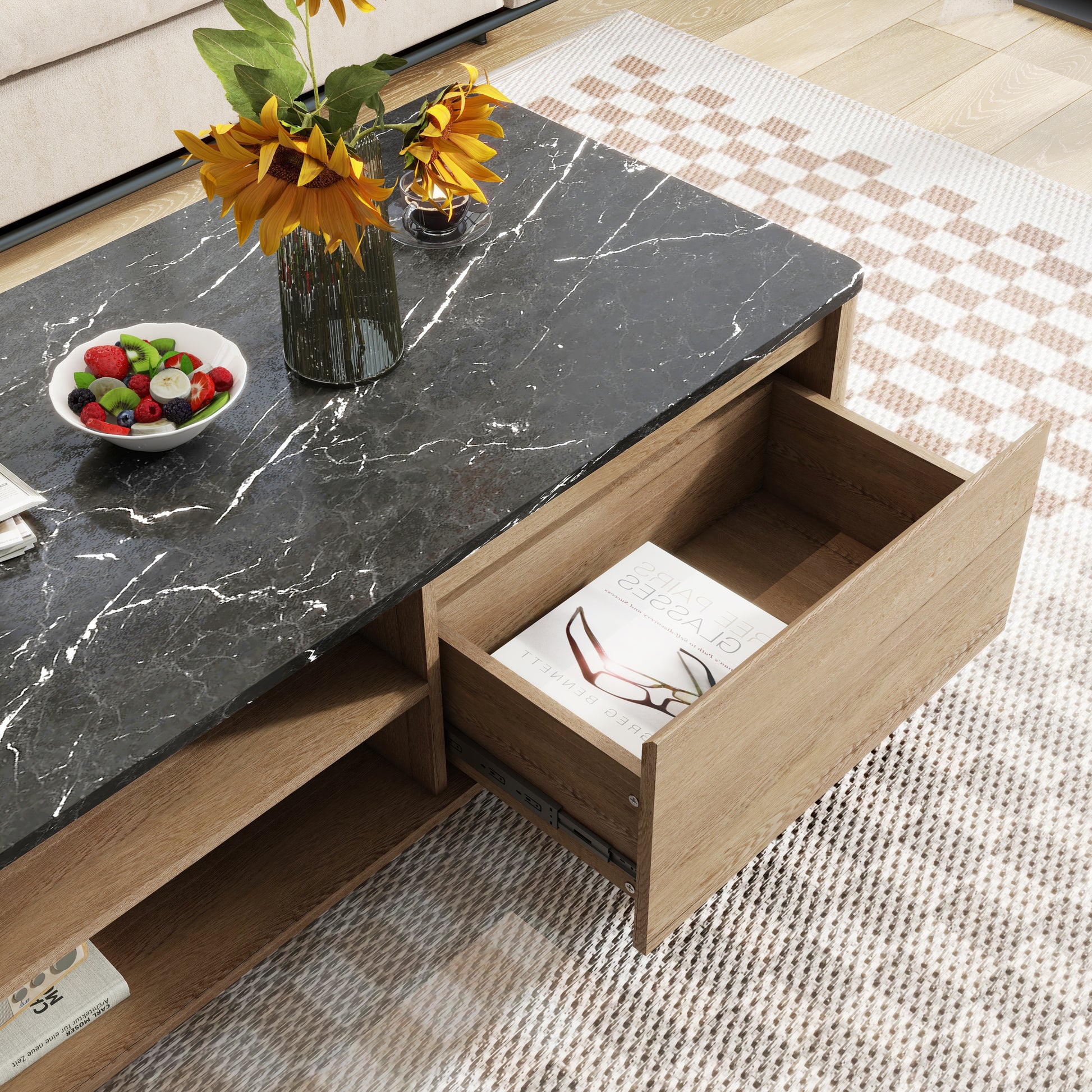 47 Inch Modern Farmhouse Double Drawer Coffee Table for Living Room or Office , Tobacco Wood and Marble Texture