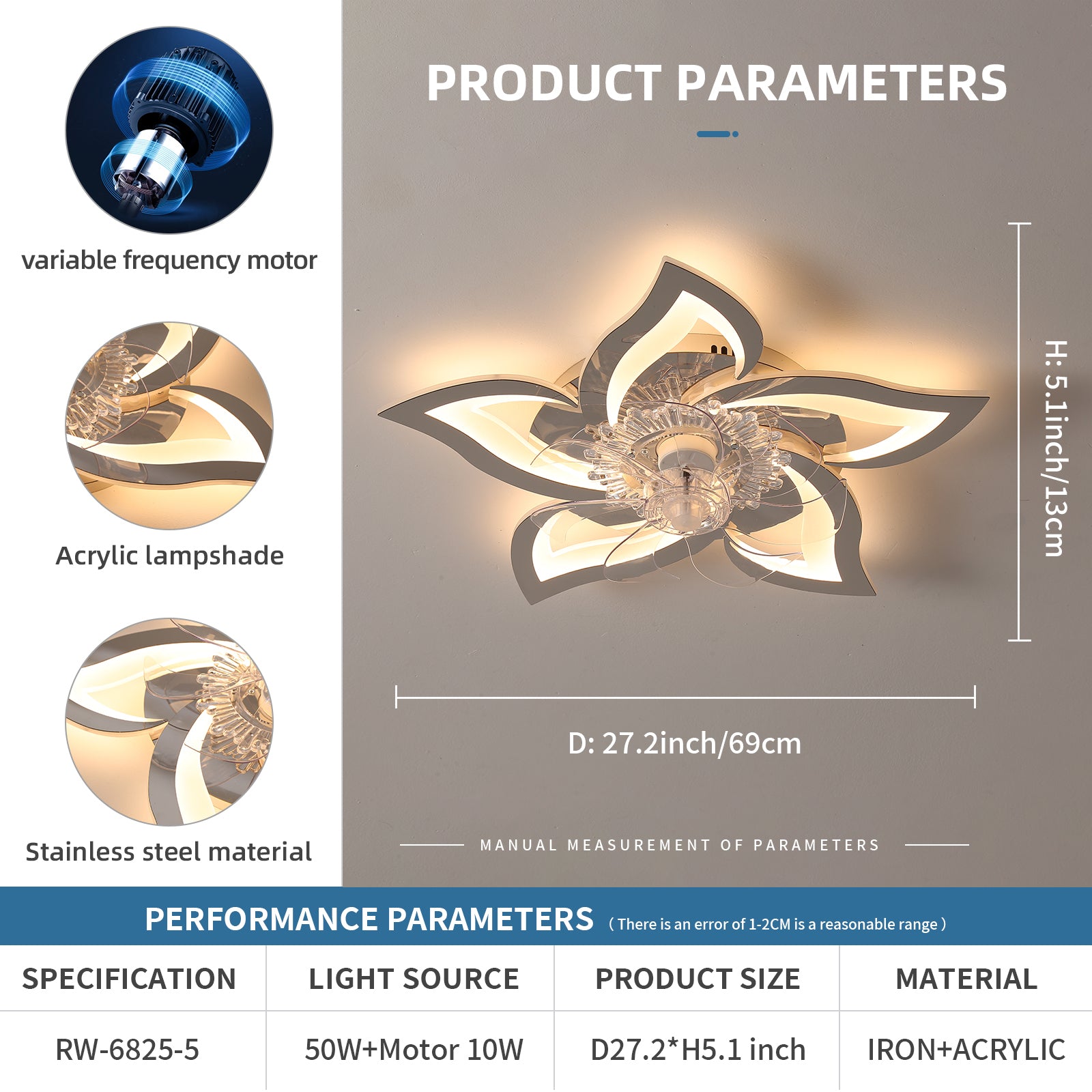 27In Ceiling Fan with Lights Remote Contro Dimmable LED,6 Gear Wind Speed Fan Light